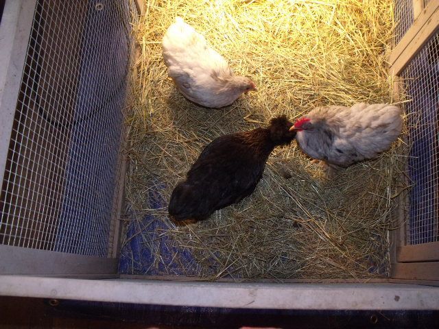 At the north end of the pen 2 Blue Splash Cochins same age as larger Silkie and one Silkie/Cochin mix, I don't remember how old it is but probably about the same age as the younger Silkies.