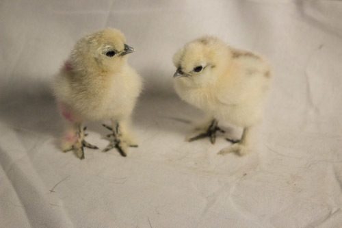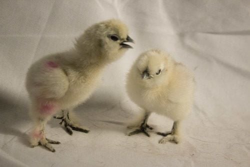 She said her silkie produce: white, black, splash and porcelain, so maybe Porcelain? and the pink on the one is just washable marker. it was to tell them apart before the one wiwth striped dried off. I am thinking the one with marker may be a white. only time will tell (: