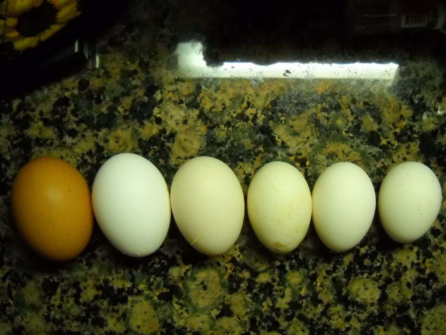 Marans dark egg 2.4-oz, White Leghorn bright white egg 2.5-oz, 2@ Buff Leghorn tinted eggs 2.0-oz and 1.8-oz, 2@ Silkie tinted eggs 1.5-oz and 1.25-oz