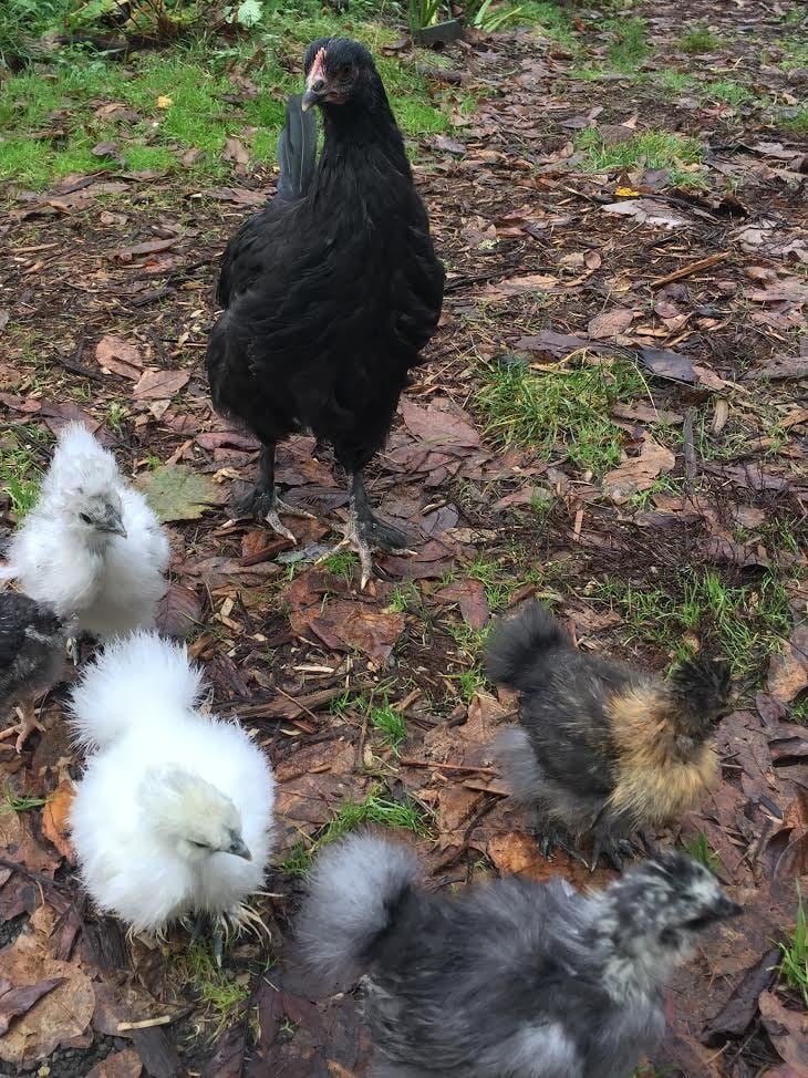 My very gentle FBCM pullet with the Silkies. Cobweb is the blue-grey one at the bottom.