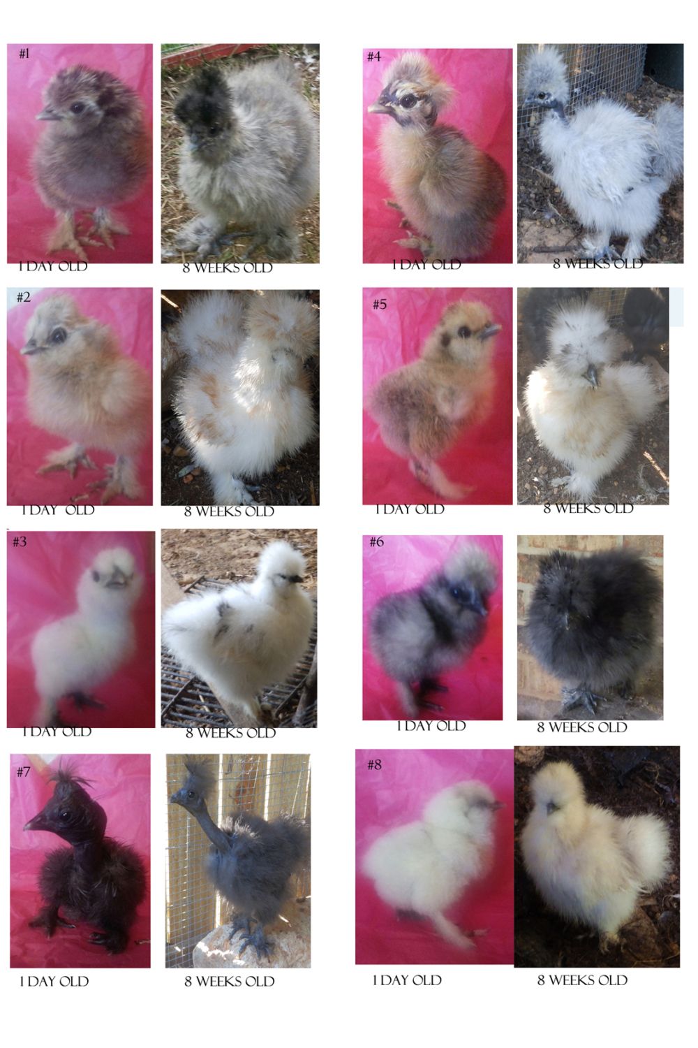 I hatched my first mixed color batch of silkies and spent several weeks wondering what colors they would come out. I spent a lot of time on BYC looking at other pictures of babies and how they ended up. I know I have some more growing to go and I don't have a final answer on some but they are now 9 weeks old and full of surprises for me. I'm showing them at one day old and again at 8 weeks old so maybe someone else can get an idea of where their odd colored chicks might end up.