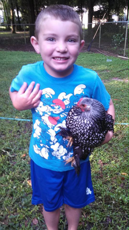 Me and my little guy absolutely ADORE our little silver laced cochin. She is my most docile and friendly chicken of my flock. she just lets him pick her up and tote her around - my roo is a Red Frizzle bantam cochin.... any idea what coloring their chicks may have ? I am very confused by chicken genetics - this little silver laced hen and another black smooth are his favorite girlfriends and this morning I found my little two egg incubator so we popped a couple of eggs in and will anxiously await "HATCHIE DAY"...