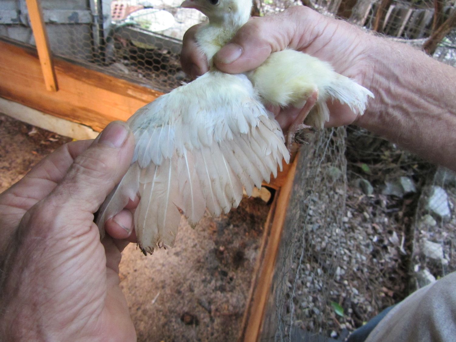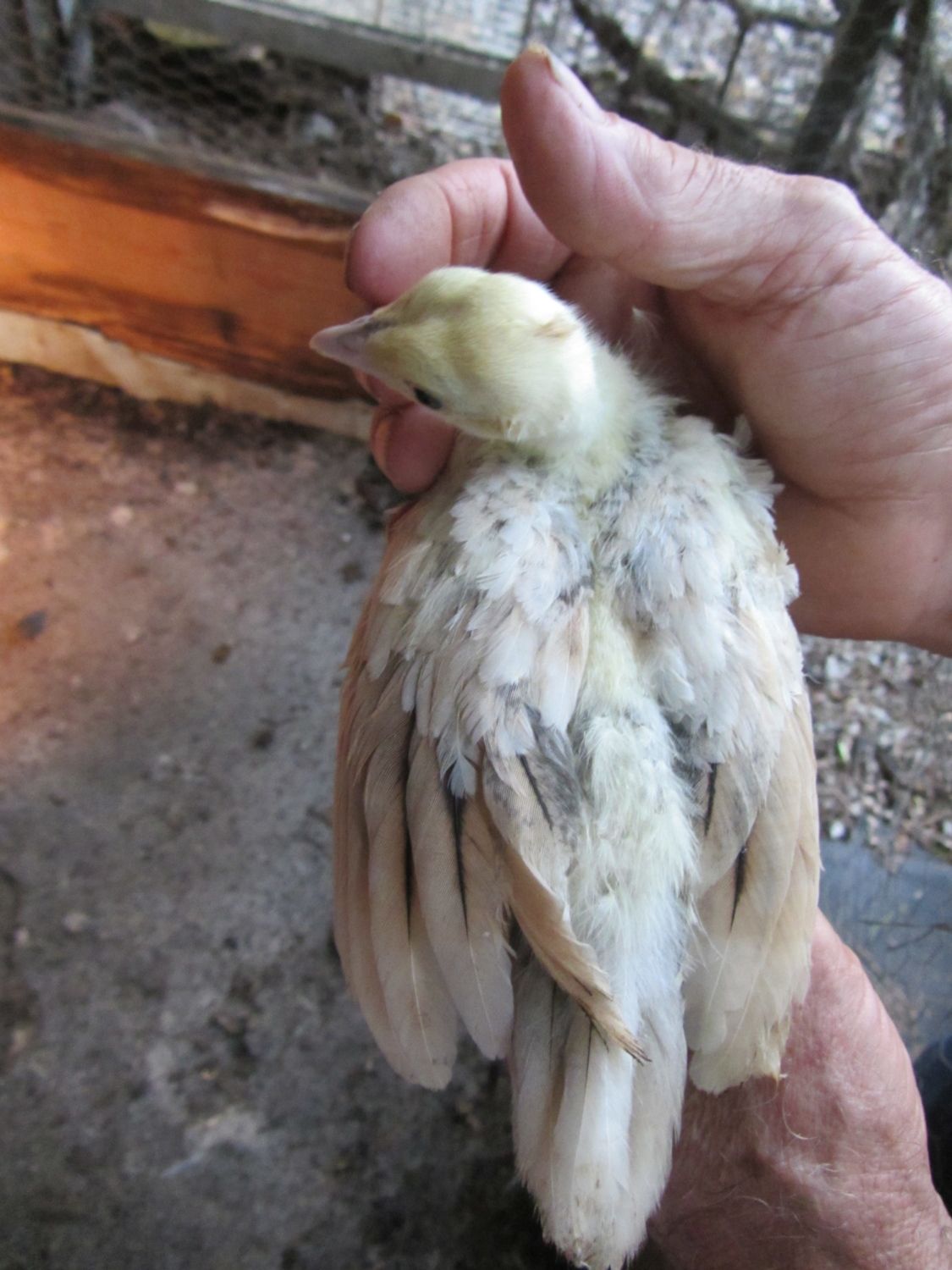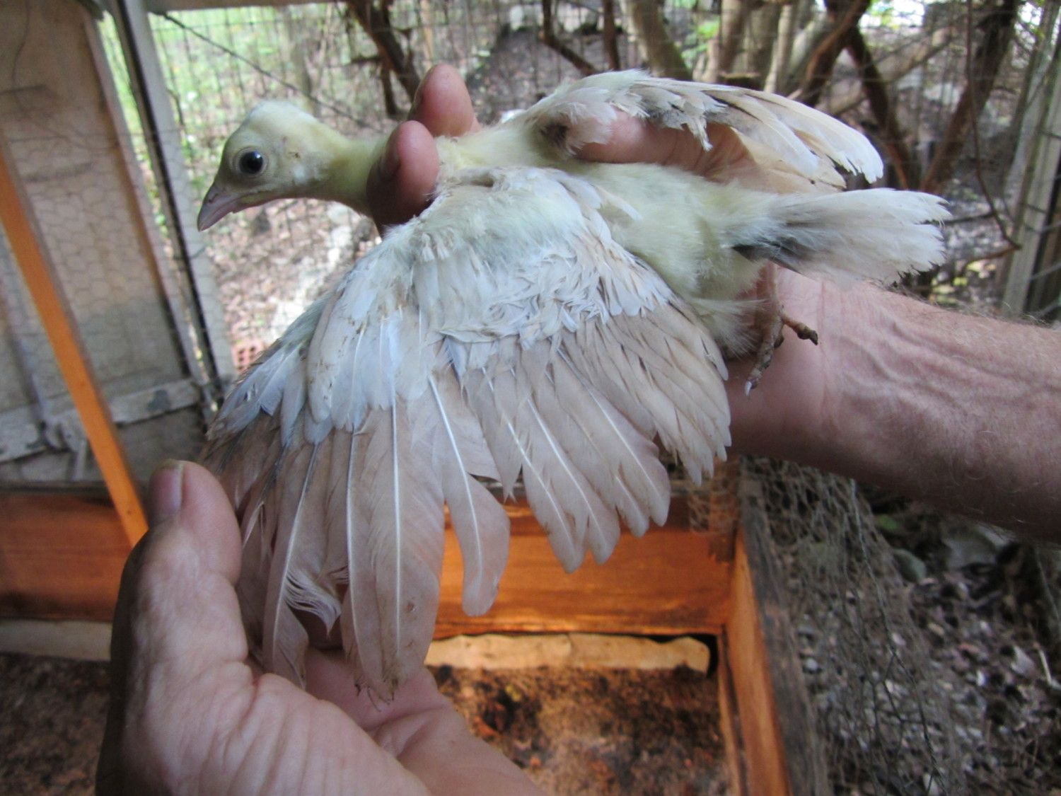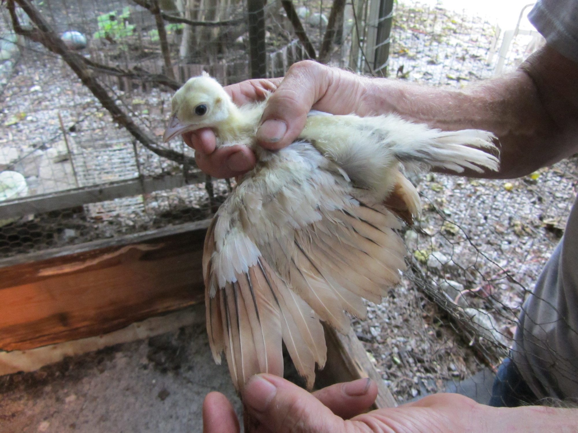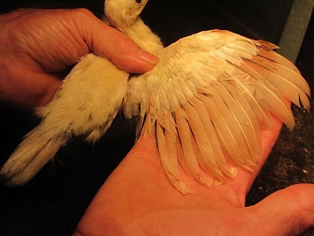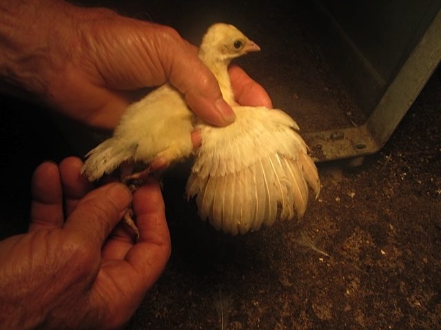 BUT,in BSSP chicks,only adult hens has this rusty colored outer flight feather color,,NOT THE MALES,so it only makes sense that BSSP peachicks showing a change in these outer flight feathers would become hens,,since my adult BSSP males outer flight feathers are all white with maybe a solid black feather in the mix only.I have 2 pied males,and neither has rust color anywhere on them.This is how I hope I am correct on sexing my bssp chicks.And I'm hoping that from what I can see in your pics provides reasons for saying they will become hens.I've posted some pics of b/s males vs.b/s hens both the same age and some at 3 wks of age in previous threads.Locate those and see the marked diffrence in much more pigment in the future males and how little change is noted in the future hens.