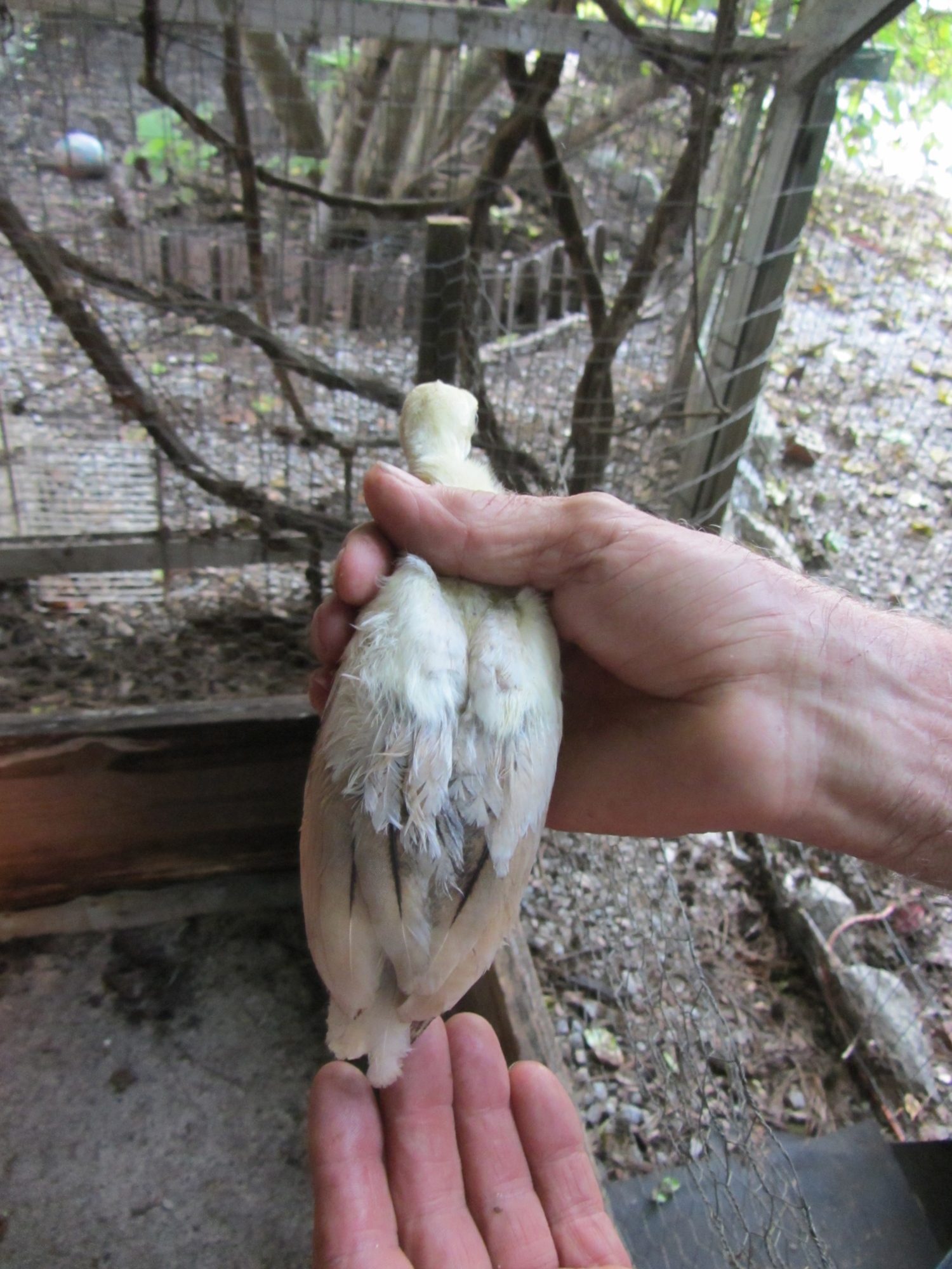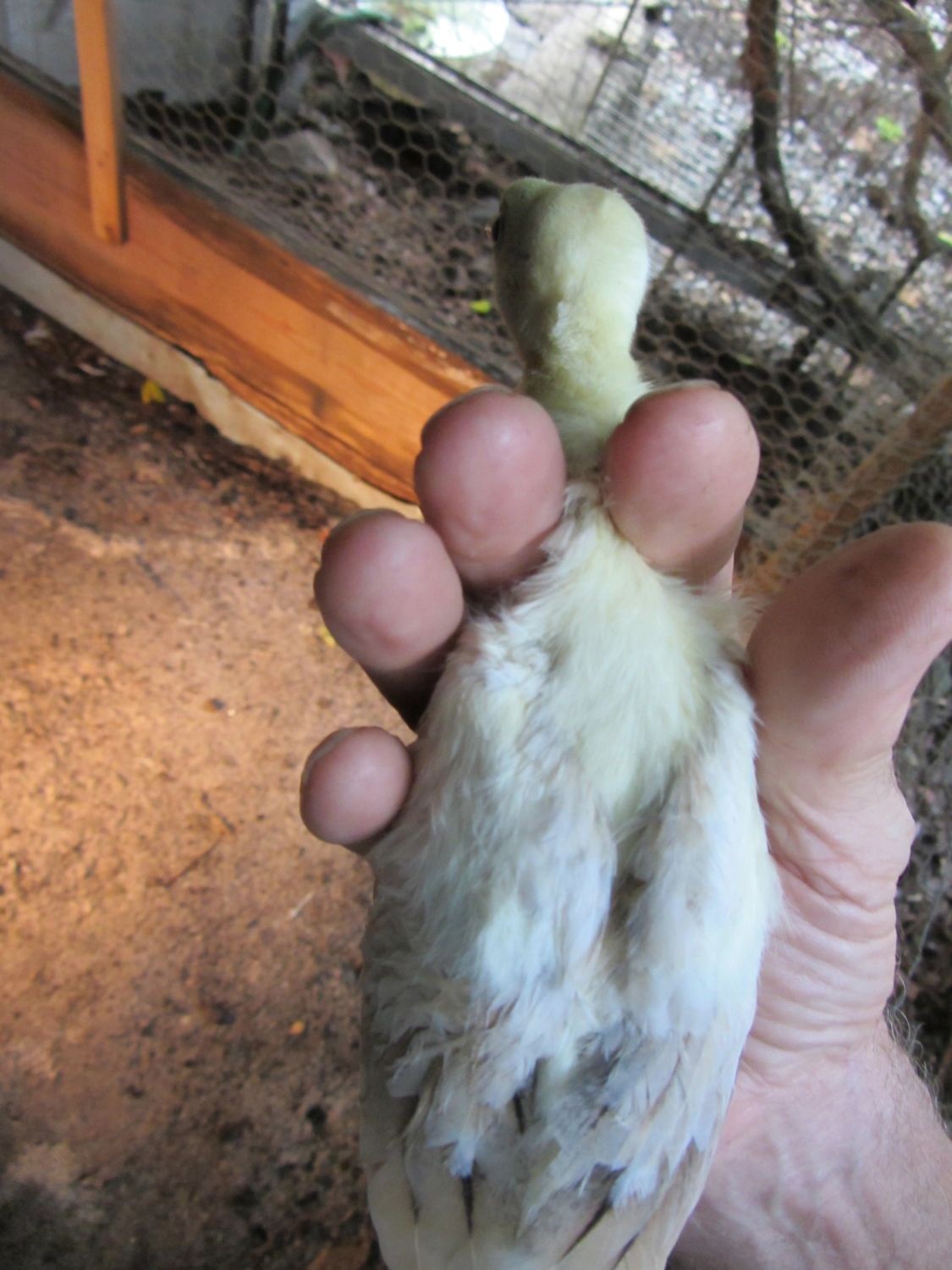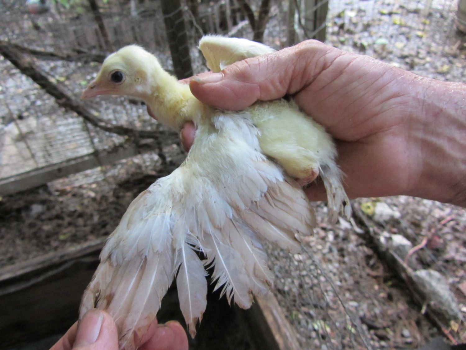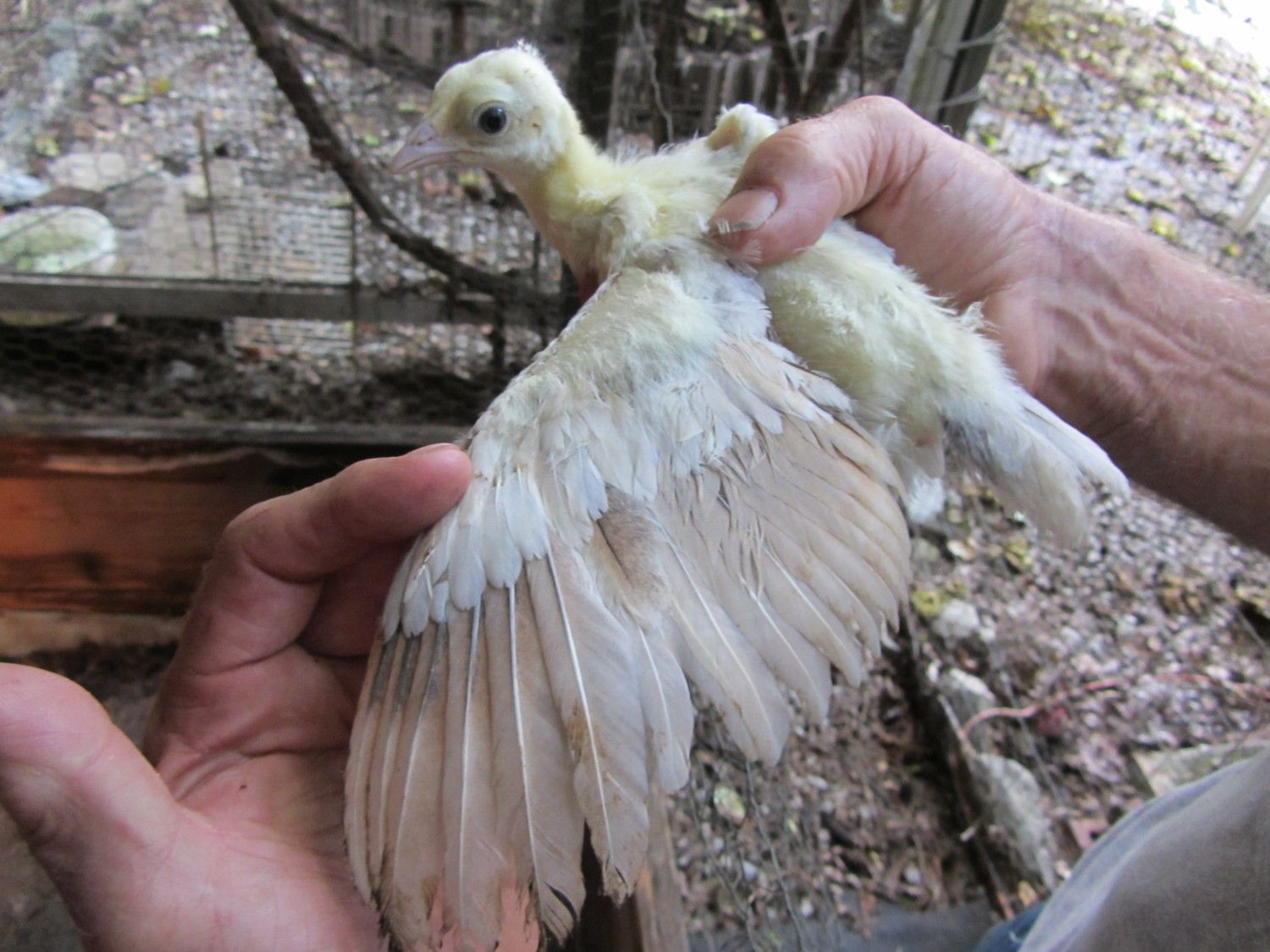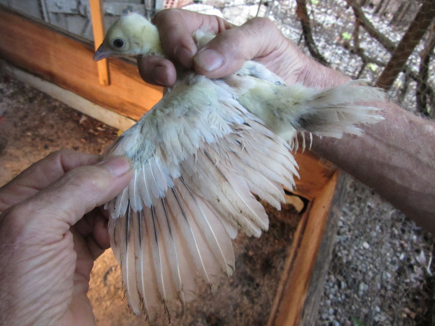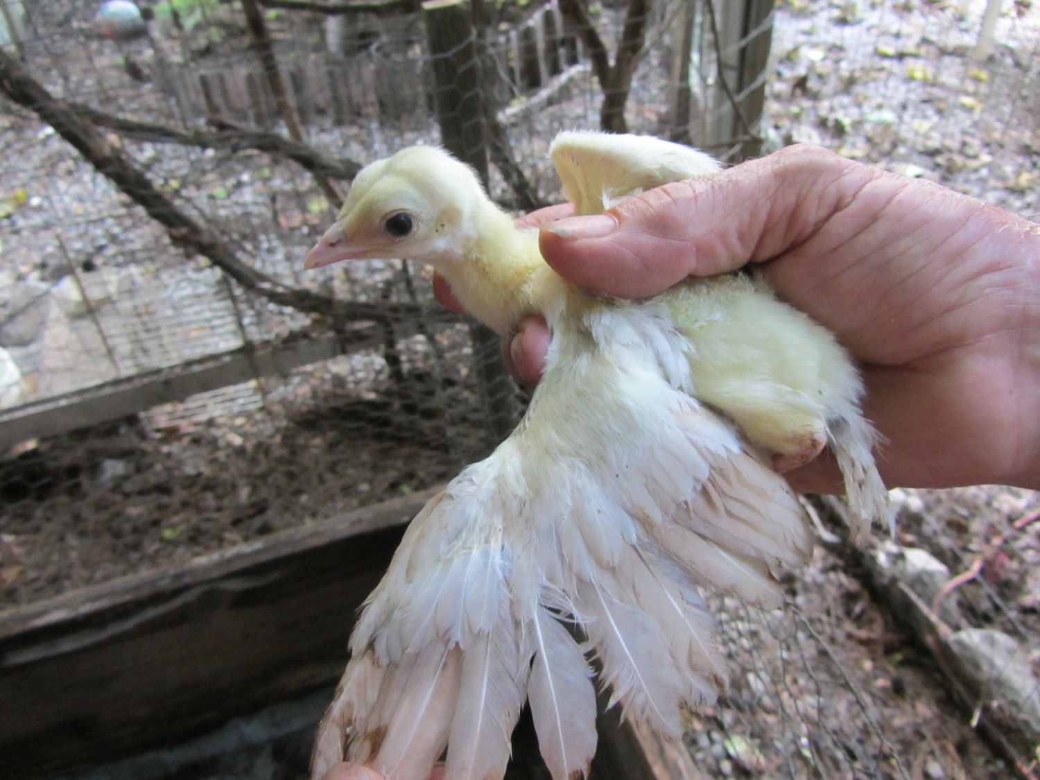 BUT,in BSSP chicks,only adult hens has this rusty colored outer flight feather color,,NOT THE MALES,so it only makes sense that BSSP peachicks showing a change in these outer flight feathers would become hens,,since my adult BSSP males outer flight feathers are all white with maybe a solid black feather in the mix only.I have 2 pied males,and neither has rust color anywhere on them.This is how I hope I am correct on sexing my bssp chicks.And I'm hoping that from what I can see in your pics provides reasons for saying they will become hens.I've posted some pics of b/s males vs.b/s hens both the same age and some at 3 wks of age in previous threads.Locate those and see the marked diffrence in much more pigment in the future males and how little change is noted in the future hens.