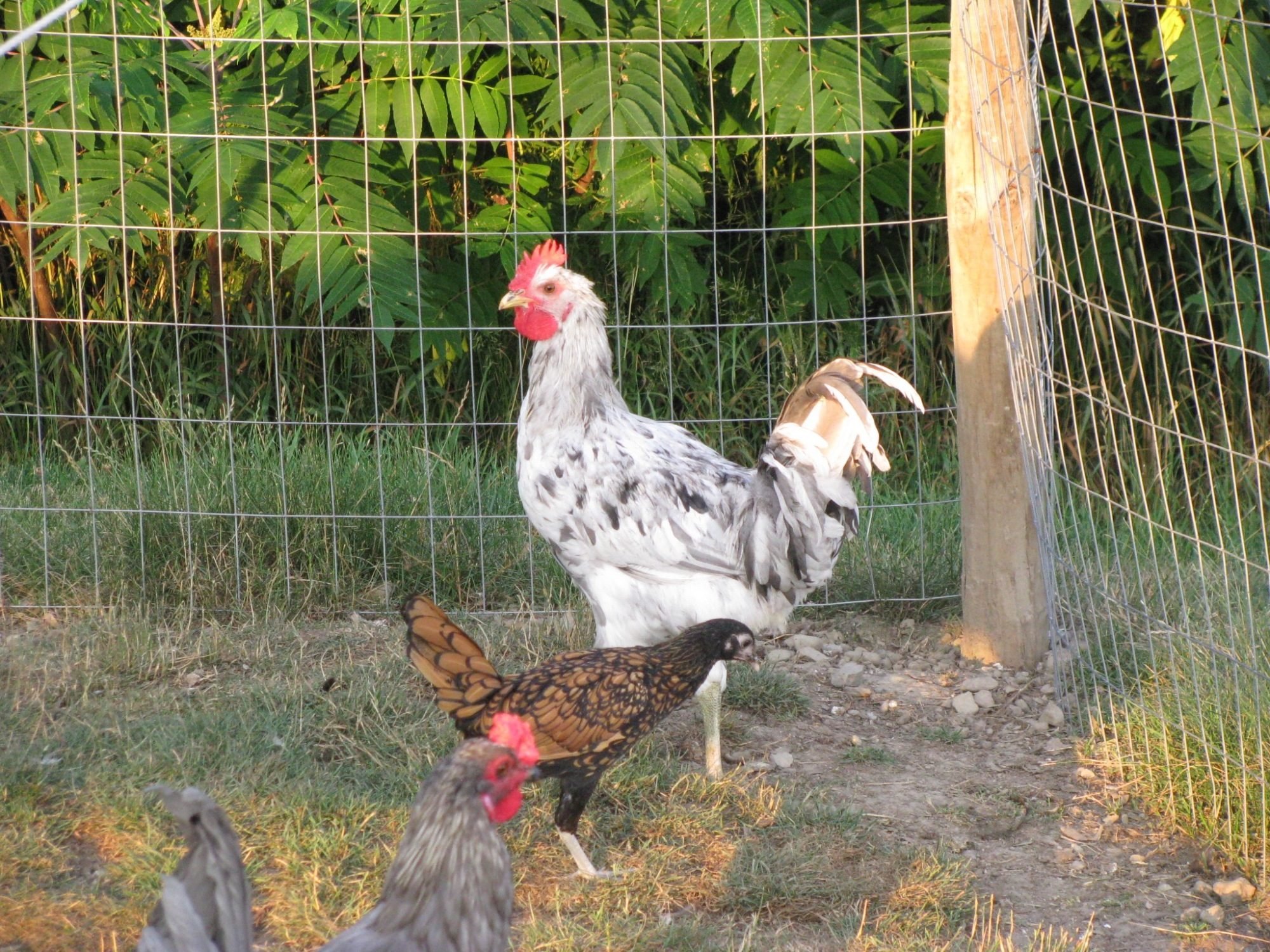 My guys have a bit better housing than that...... (prison?) -- but then I have far fewer. 6 breeding age males at the moment. Have thought from time to time it would be nice to shelve the roos when they aren't needed, for example the Isbar male is so sweet and enthusiastic that he tends to over-breed the smaller Isbar females. At one point they weren't leaving the coop for pretty much all day - except for one pullet of a different breed that would hang out with him. Eventually she even started resisting his attentions...so I took him off to live alone. (Which I hate -- but seemed like a possible protection for the hens) -- Later I found his pullet pal - did have a by that time healing wound on her side...that I only found when giving her a bath.