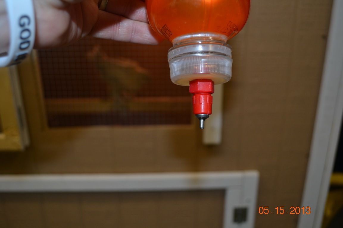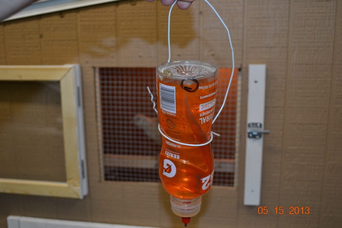 Hung with a piece of coat hanger wrapped around bottle. Black circle shows air hole so water will flow as they hit the nipple.