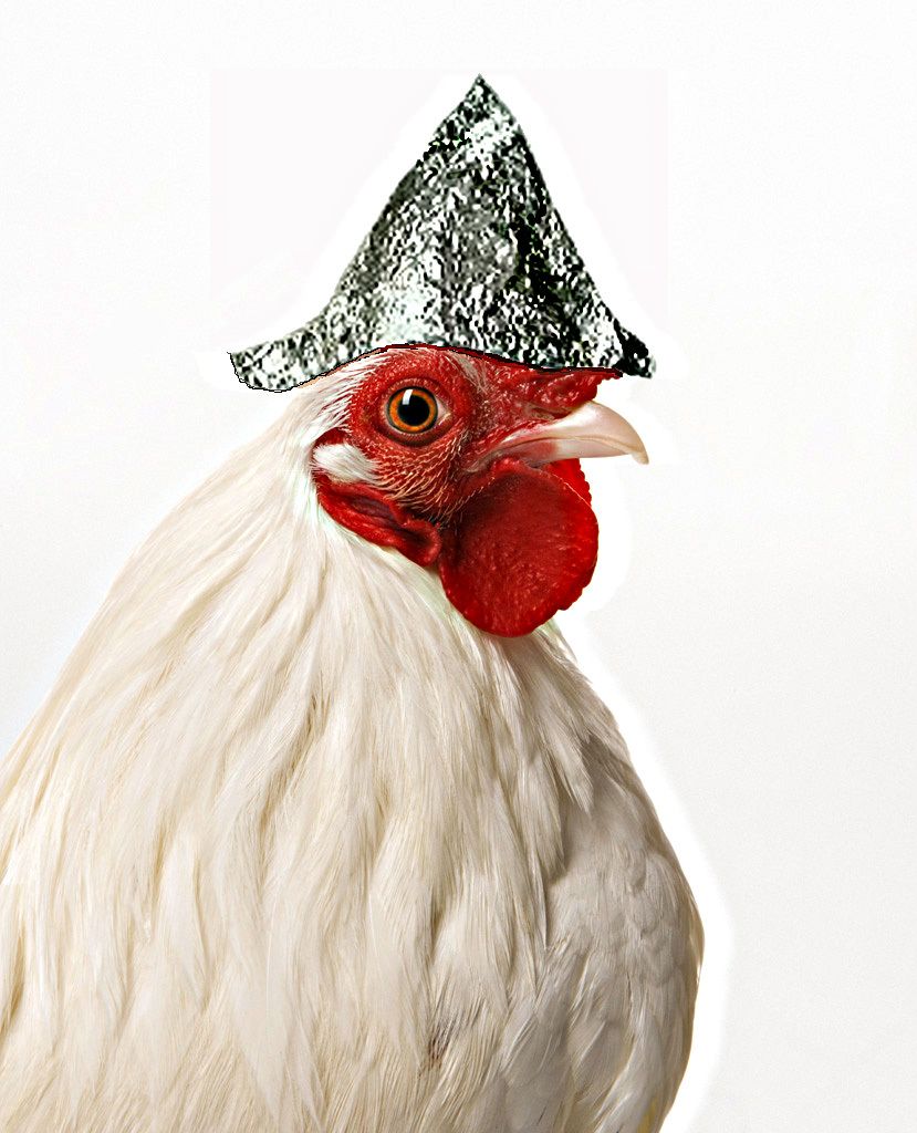 Now I have a problem, though....... I have a mind that thinks in pictures...... It didn't take me long to go from "tin-foil hat" conspiracy theorists, to chickens with tin foil in their nest boxes, to chickens wearing tin foil hats.....