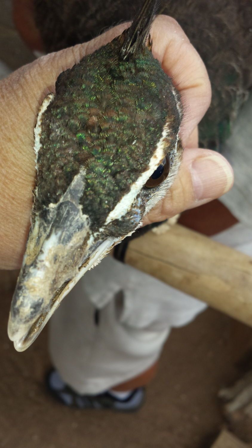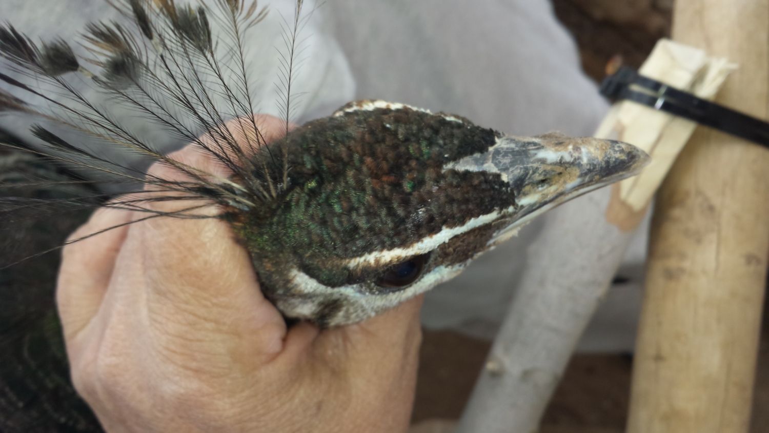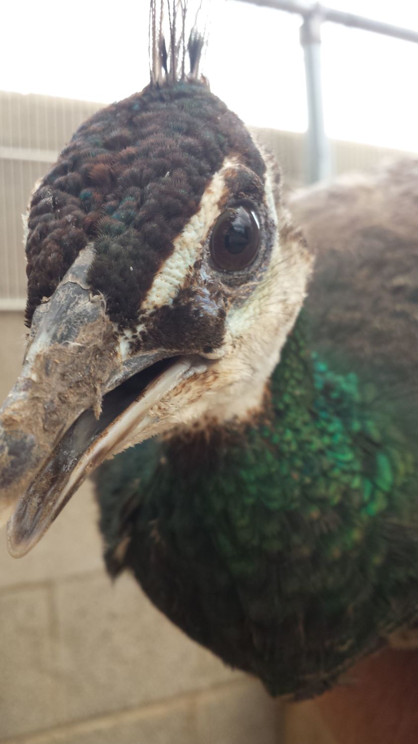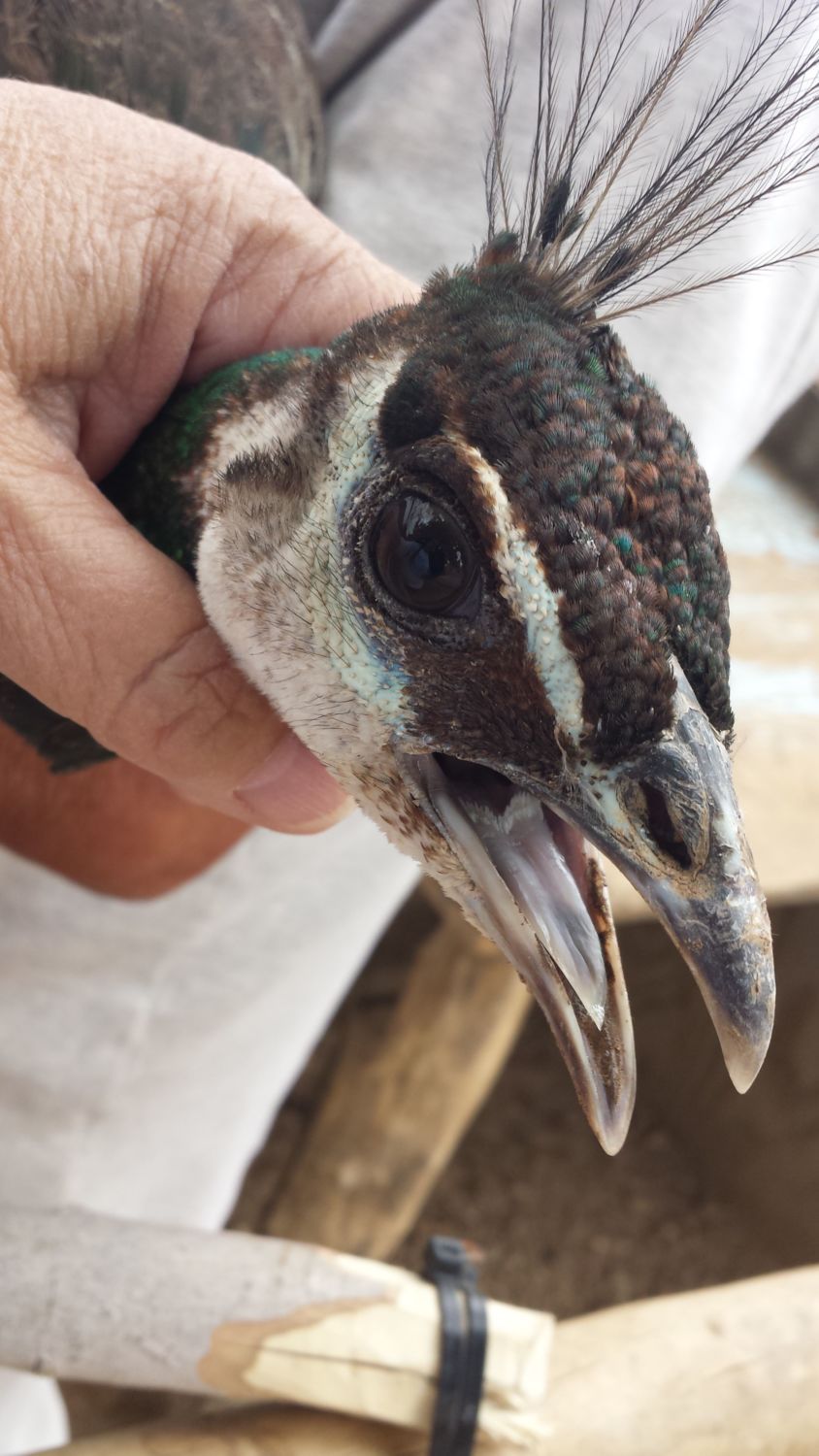 My elderly pea-loving neighbor came and got me today and mentioned his peahen was ill. I went over to see what was wrong and found her gagging and mouth breathing. Periodically she made a sound like a kid swallowing snot. (Sorry, I don't have another good way to describe it.) I didn't see what was wrong until the second time that he held her and I actually tried touching and pressing on her sinuses. Then it was pretty easy to spot: