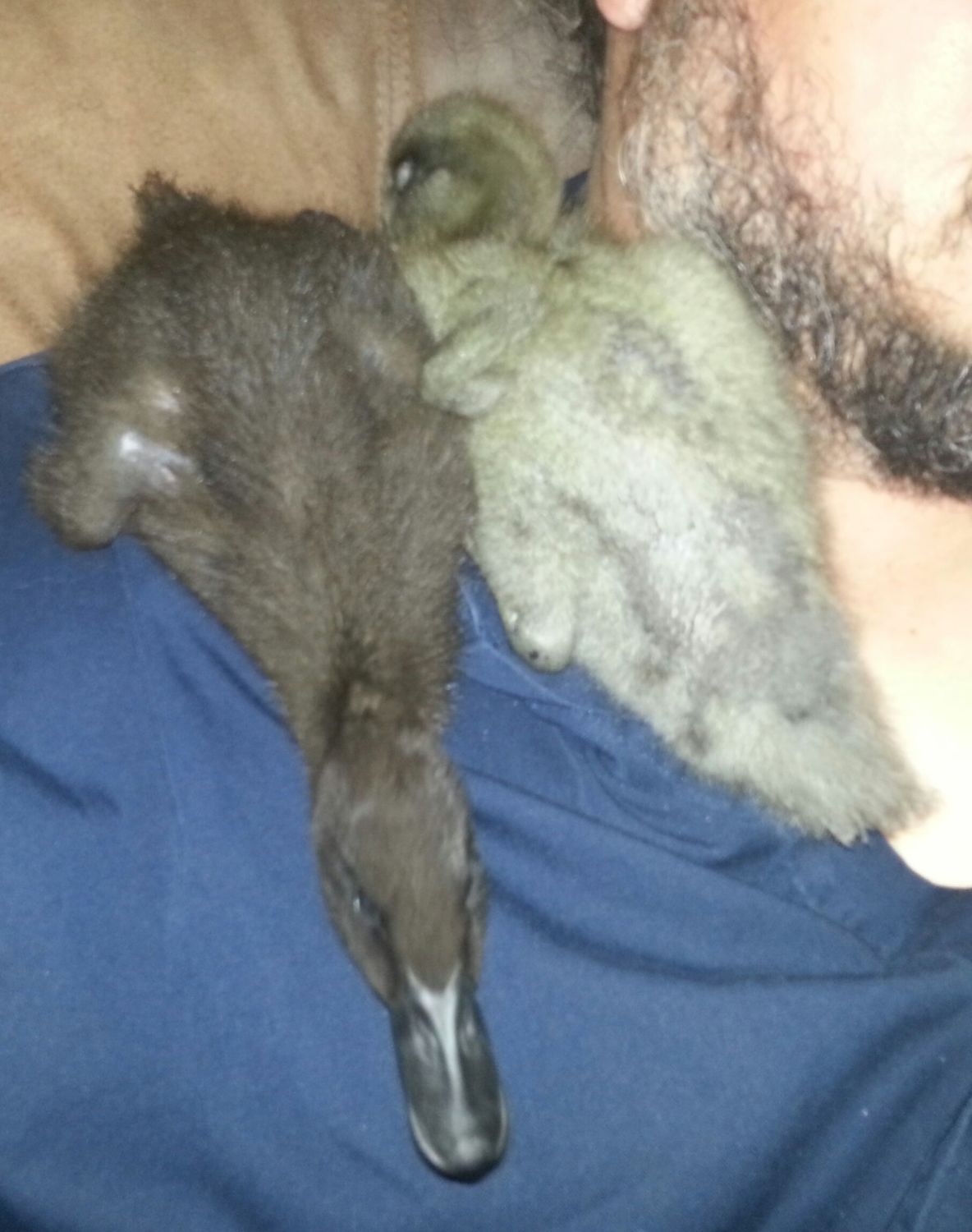 Jun 26, 2014 #1 T Tevyes Dad Leader of the Quack 8 Years Friend Joined Apr 22, 2014 Messages 2,666 Reaction score 1,116 Points 326 Noir and Mystique have been with us 2 weeks (they are 18 days old.) They are about 3/4 lbs each. My HD and I take turns being momma duck... This is what happens when I set them on the couch and sit near them...