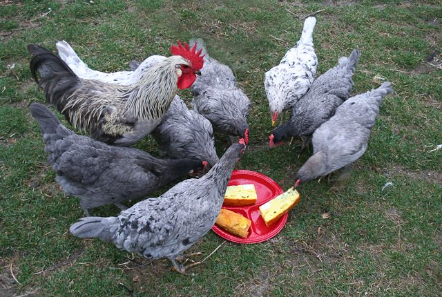 Here is the whole flock this morning, looking like drowned rats, eating blocks of baked eggs in a storm.