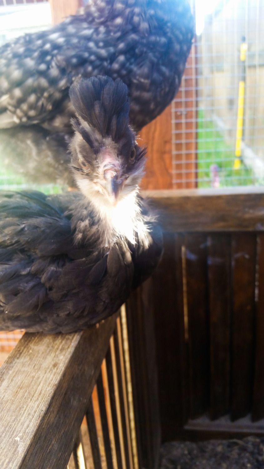Yesterday I went and got another polish chick (I really want a polish). She ran from the farm store guy as they usually do when when being caught, but once getting home I noticed she didn't move much. Last night I had to place her under the brooder because she wouldn't walk under there with Bess.