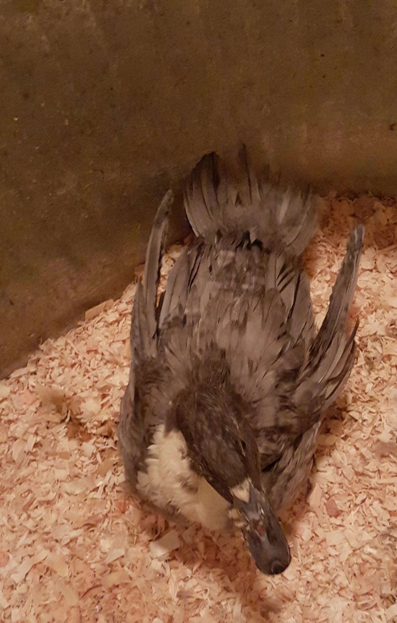 I have 3 other ducks and they all pick on him. His brother might be okay if he is taken from the Pekins, can see how he does with just Skippy. His feathers are kind of rough, but he is puffed up in this picture, hissing at me. He was mad after I cleaned his billIs there one of the other ducks that is nice to Skippy? he may like it better if he has a buddy while inside. Get him on some good quality poultry vitamins too. Where did you get Skippy? His feathers look pretty rough like it's a nutrient def.But this could also be genetic. But Flock raiser is a good quality product I used it for years from hatch on to end of life. No spinach it does something with calcium just can't remember what at the moment. Make sure while you have him inside that you offer him grit along with his feed not in the same bowl but a separate bowl so he can use it as needed. He looks so sweet, I hope something we recommend will help him get on track health wise.