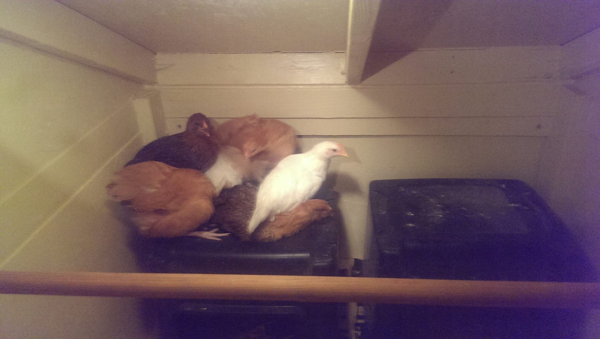I enlarged your picture and my first question is.....WHAT are those black box-like things back there? Are they nesting boxes of some sort? .. Storage containers? The real solution to keeping them off that box is to put a scrap piece of plywood, on a steep angle, over the top of that whole back section. This will prevent them from roosting there at all. Something like this example: