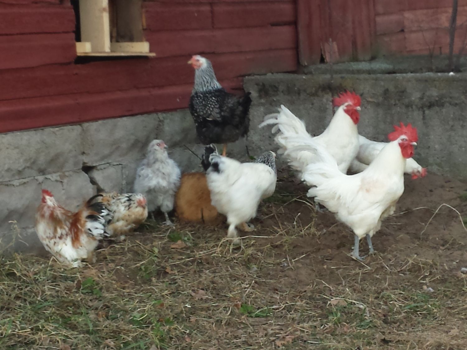 My current chickens (minus one EE that didn't make it into the shot, and the chicks that came in the mail last week.) I had 20 chickens when the summer started, but a couple died, and I gave some to my sister. That left me with 9. Now I have 19 including the chicks.