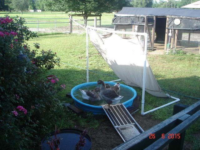 They are very smart and have good memories too. If they have adequate grazing then that is what they will eat and the FR crumbles will just be secondary. They sure look good and healthy. I envy you having nice green grass. Flock Raiser is a great feed for our flocks. Of course organic would be ideal but i for one can't afford it and would have to travel many miles just to buy it if i could.Geese sure are smart. Here's a couple of pix with one of them on the ramp. I just happen to catch one using the ramp and grabbed the camera. I'm in the process of changing the shade cloth, plus extending it, so I don't have to run out and move it every 45 minutes. Originally the shade cloth was set-up for my chicken tractor, where I kept the guinea keets. Logs I don't have. I 'm lucky to have one tree on the this property. I thought I'd put the pool in their coop, but it would take up a lot of room. I just might keep it buy my Knock Out Roses. If I do, I'll build a deck and put the pool on it, with the kitchen drain and PVC pipe.