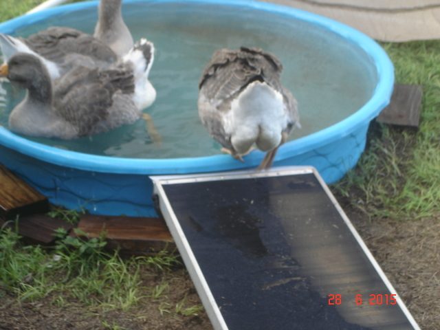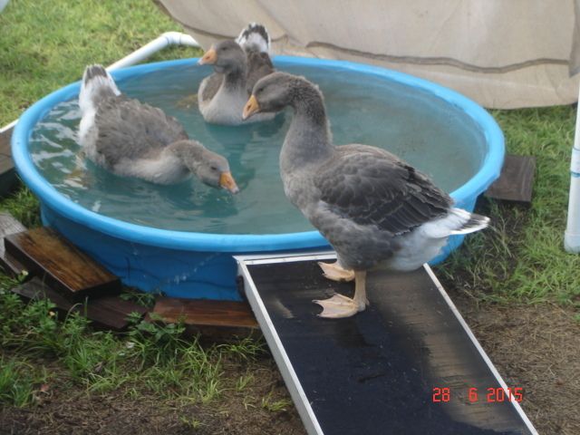 I had to put a tarp over the geese coop to let it dry out. I can't screw in anything into wet wood. Right now the geese are guests in the guinea coop at night. They all get along beautifully.