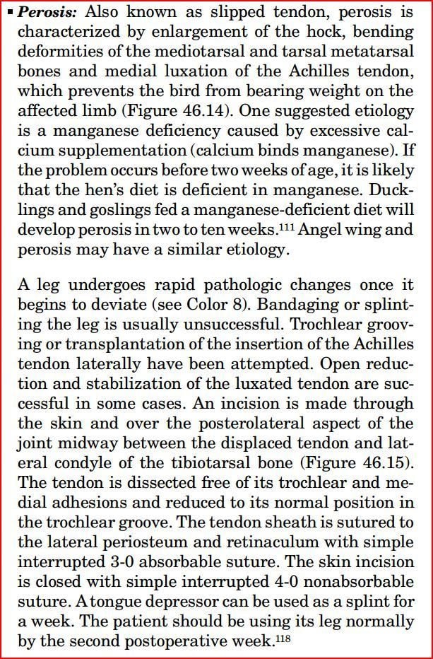 Jan 31, 2019 Thread starter #4 casportpony 🦚🦆🦃🐔 BYC Staff Project Manager Premium Feather Member 13 Years Friend Spirit Educator Joined Jun 24, 2012 Messages 155,873 Reaction score 467,903 Points 2,542 Location The Golden State More links: http://www.poultrydvm.com/condition/manganese-deficiency Thanks to @Eggcessive for this http://www.duckdvm.com/condition/slipped-tendon