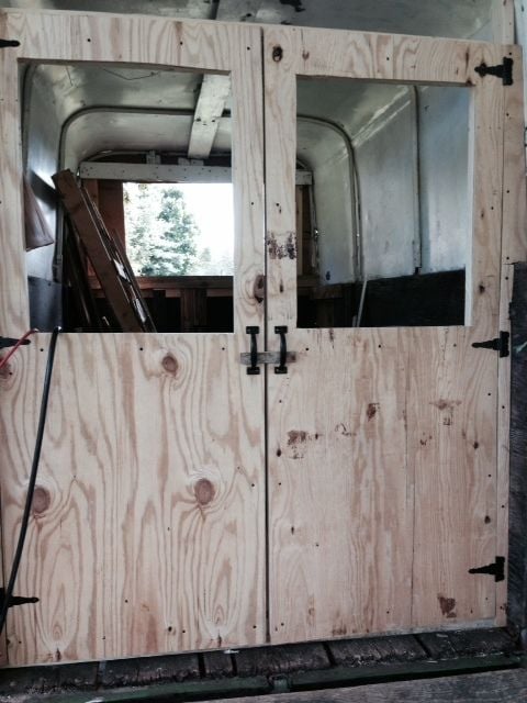 Hubby has done a great job on the doors at the back. Each door will have a large window cut out and the top board will have vents cut out. Excuse the mess (we're storing a lot of the supplies we're using in the trailer). Hope to have the windows cut out and trimmed by weekend's end, however, it's been hotter than the hinges of Hades here and we're old folk that move pretty slow on a good day