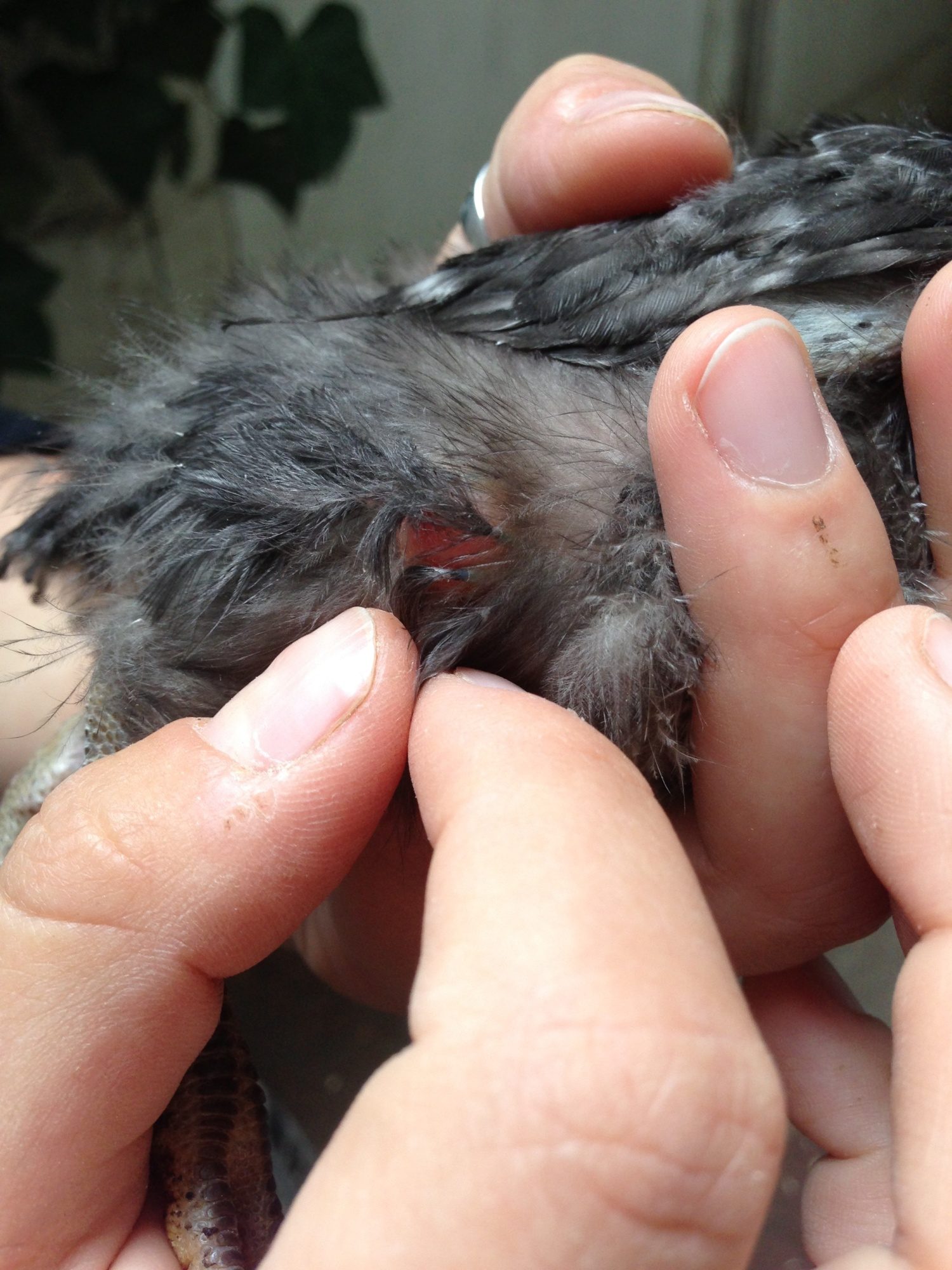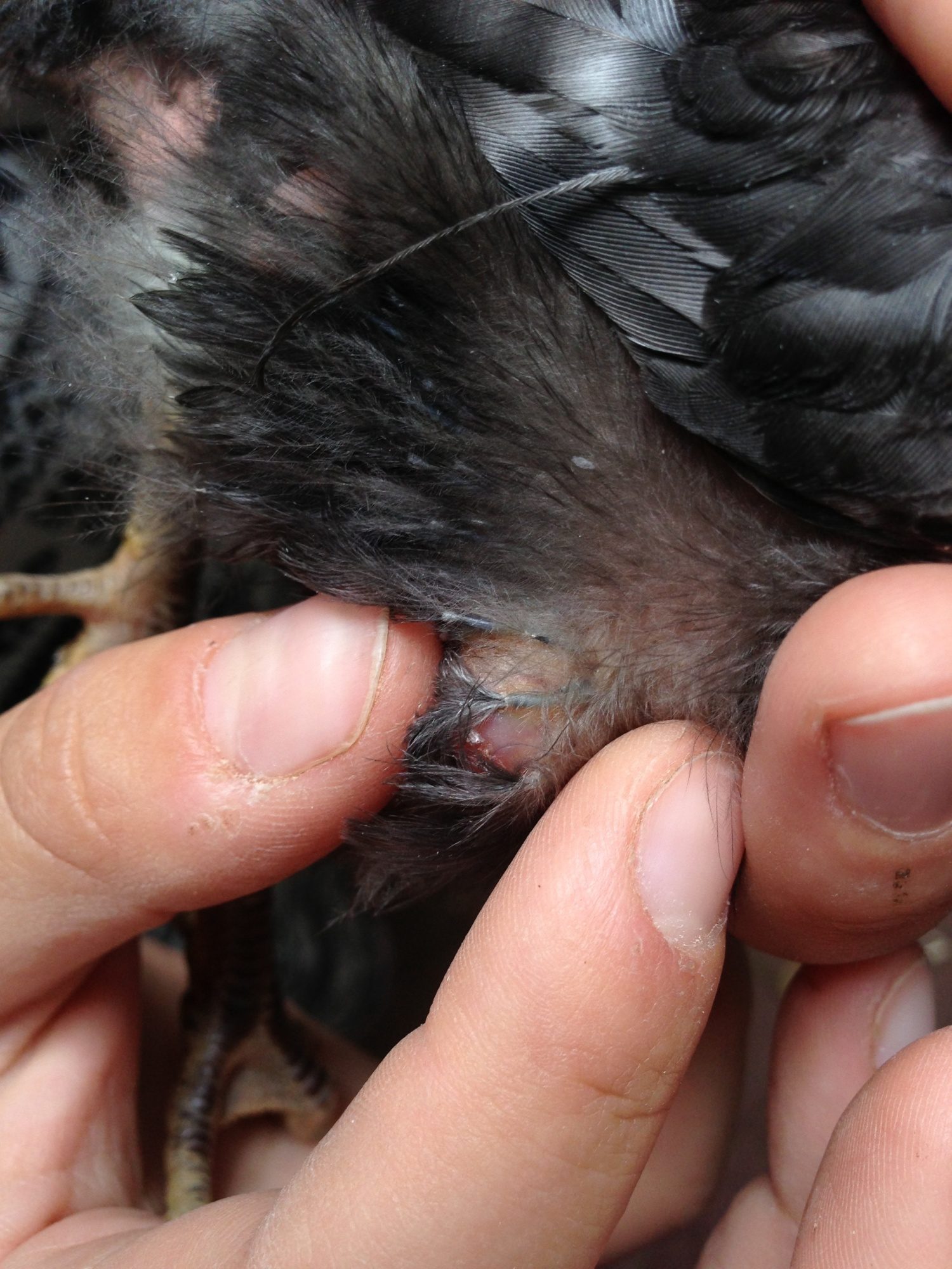It doesn't seem to bother her if I touch near the area, though I have not done much physical investigation so far, for fear of hurting her. She is behaving completely normally. Eating, drinking, bright alert and reactive. In fact she is one of my sassiest and friendliest chicks at this point. Every time I place my hands in the brooder, she flies onto my arm and tries to climb to my shoulder.