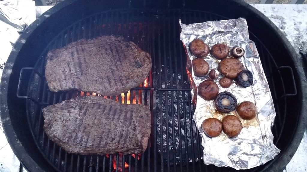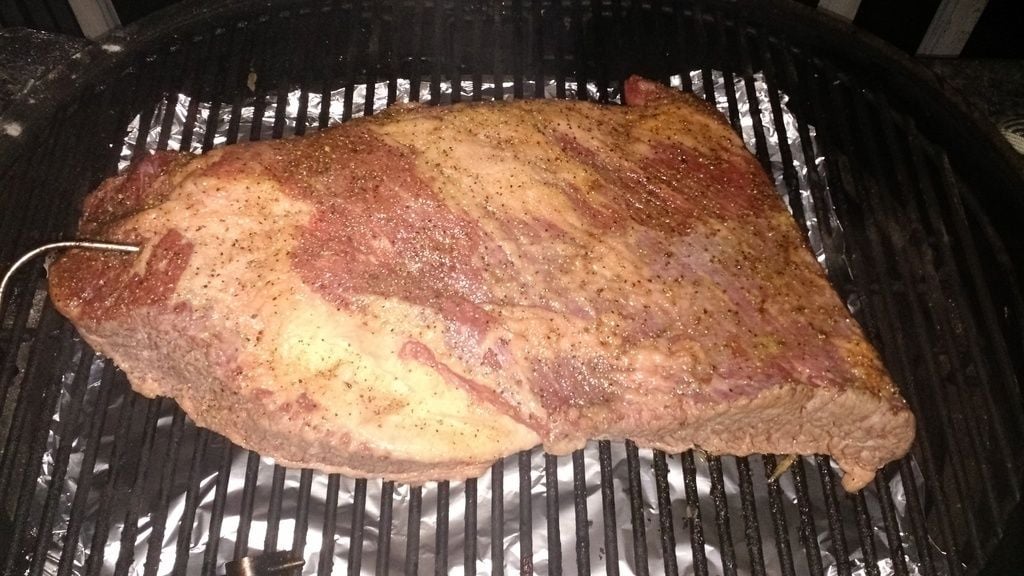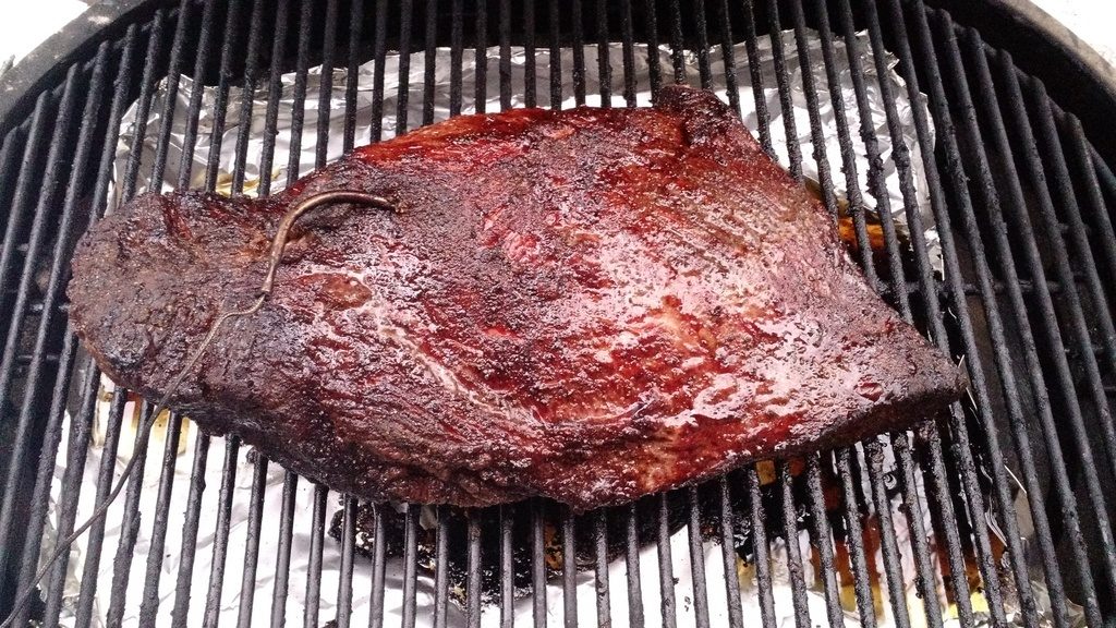 Couple flank steaks for dinner. Then a brisket to smoke overnight. Grill must have run a little warmer than intended because the brisket is done already. The ceramic grills can use so little charcoal(lump not briquettes) and be stable enough you can sleep while they cook without any sort of controller. I do use a Maverik remote thermometer that has alarms to wake me if a temp gets out of line. No need to use a water tray or wrap to keep moist, only wrap when done to rest and keep hot till dinner.
