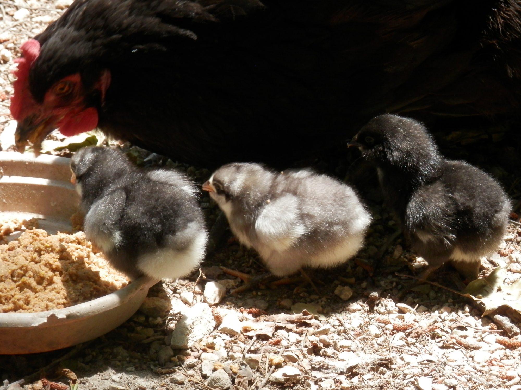 Here's BB and the 3 chicks she hatched. She has 2 blue Orps and one black Olive Egger.