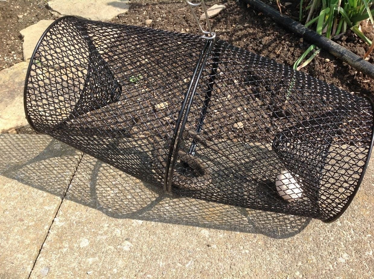 It is a minnow trap, the kind that has an inverted cone on both ends. I cut the smooth small circle off each end so the edges were jagged. Just trapped my first rat snake or chicken snake, a 4-5 footer.