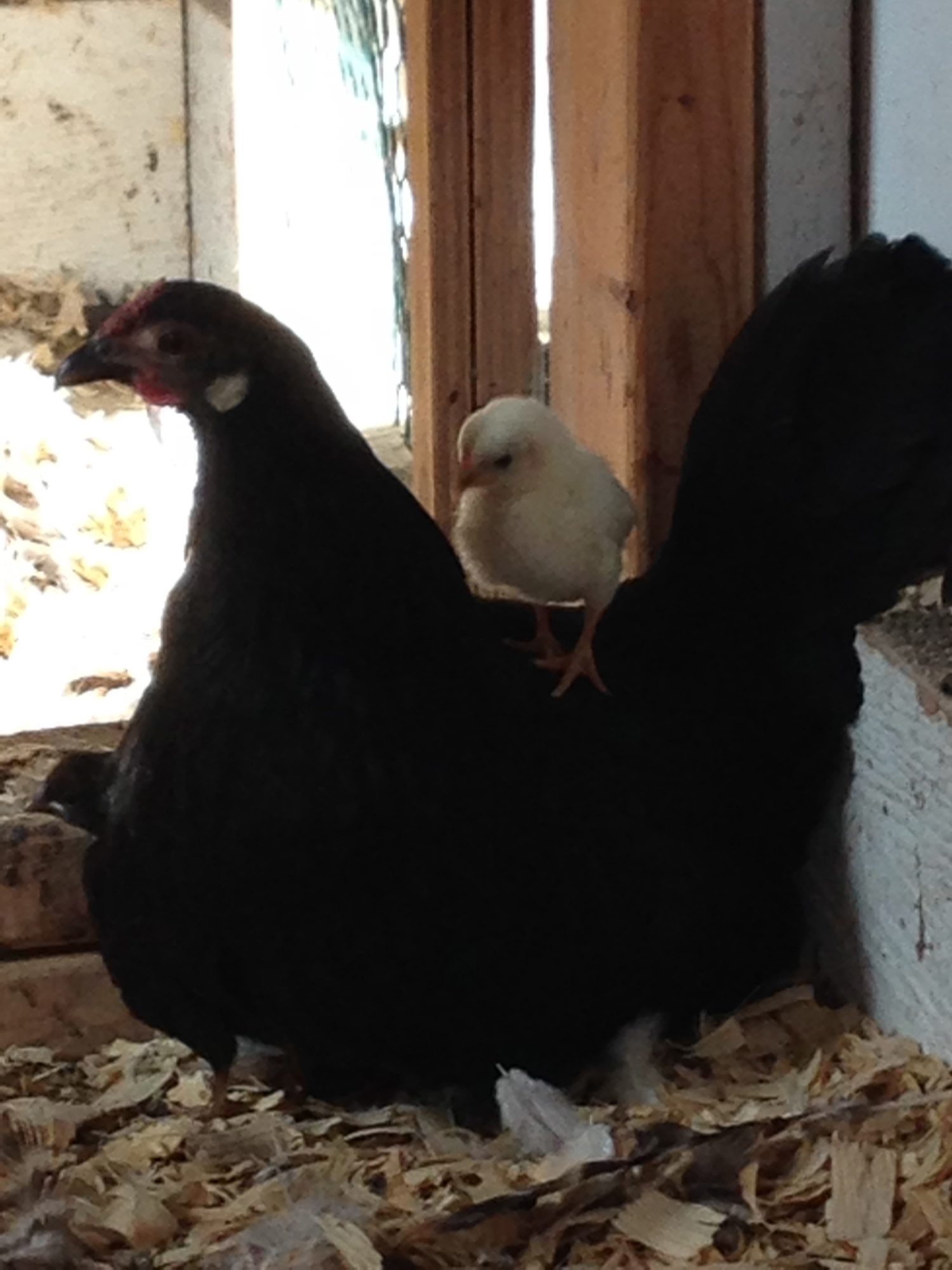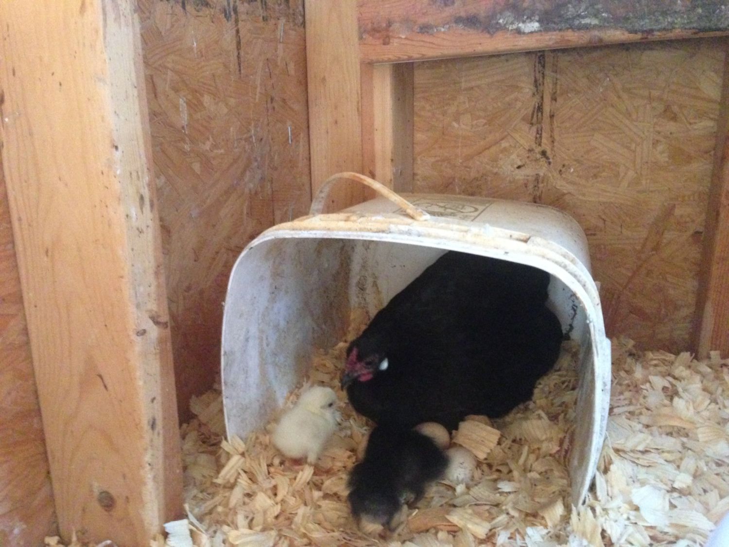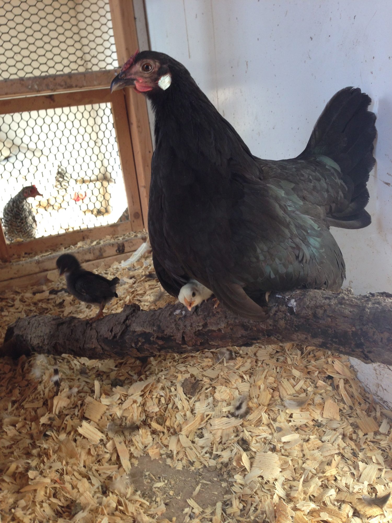 One week ago I was doing my morning chores in the coop and heard a scratching noise behind a wall space. I had to clim up on the roost bars and reach way back behind a wall space to pull out my bantam white faced black spanish chicken which I thought just fell accidentally back there trying to roost way up. After I had her out she ran outside and I started to heard the beeping…….. OMG, she hatched out some chicks back there!!!! Sure enough I pulled out 3 baby chicks, stuffed them into my coat pocket to keep warm and scrambled to set up a brooding area for the little family. After setting everything up I caught mommy hen and reunited her with the babies. Thankfully she is a very good mom and takes excellent care of the little ones.