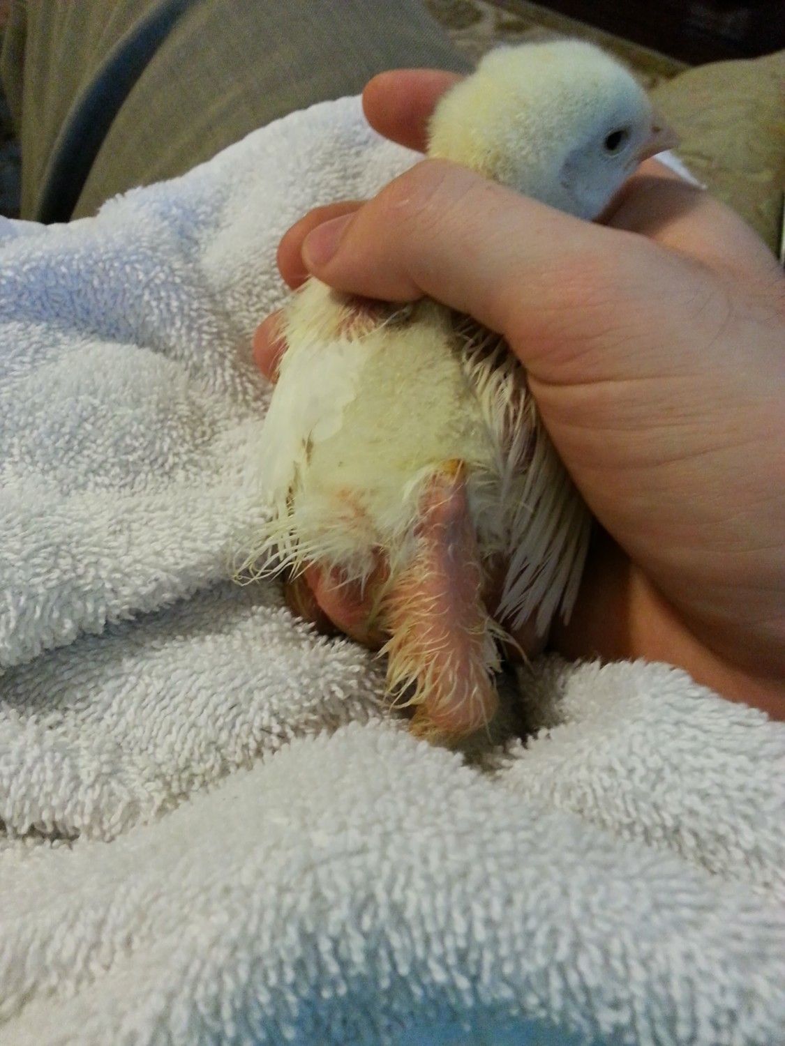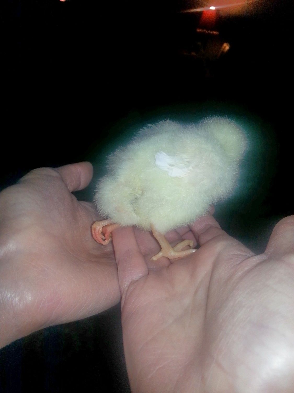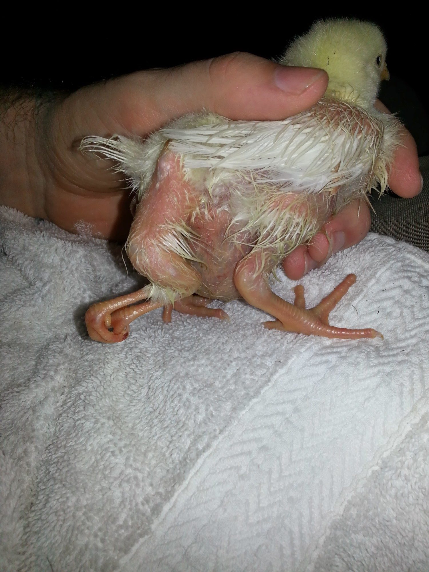 True story. I got her from Atwoods, along with the others that I originally planned on getting. She's a white plymouth rock, and I'm guessing she had a twin whose legs are now attached to her back. I felt bad for her, so I took her home. The Atwoods employee helping me was excited that I was willing to take her and gave her to me at no charge.