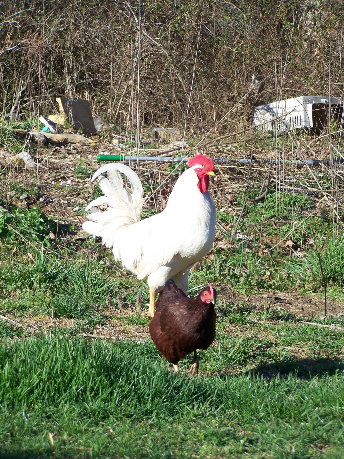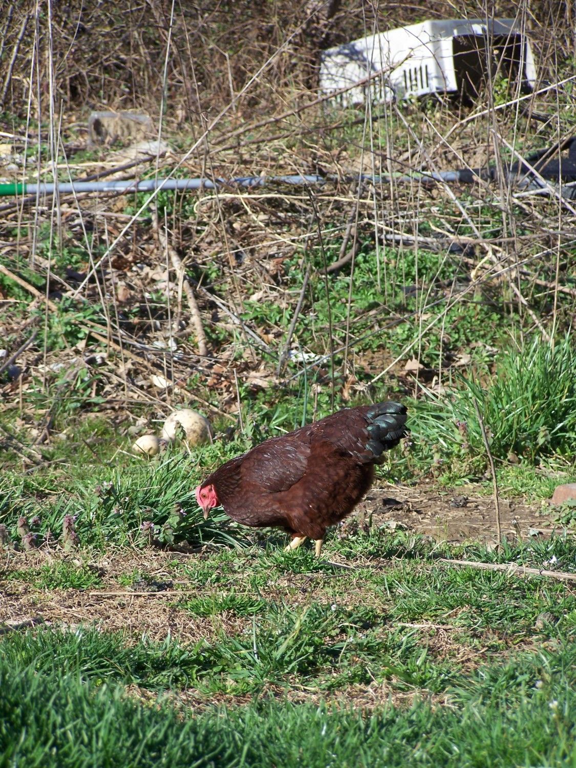 Chocolate our bantam RIR hen decided to make a break for it. I built them a run (yea, apparently not a very good one!) and the little sneak got out somehow. And then she went over to Moses, our standard pearl-white leghorn and mated with him! I have been keeping her with our sebright so I could hatch out babies. Now she has spoiled all my plans. And the greatest part? She has finally decided to start brooding! Stupid hen.