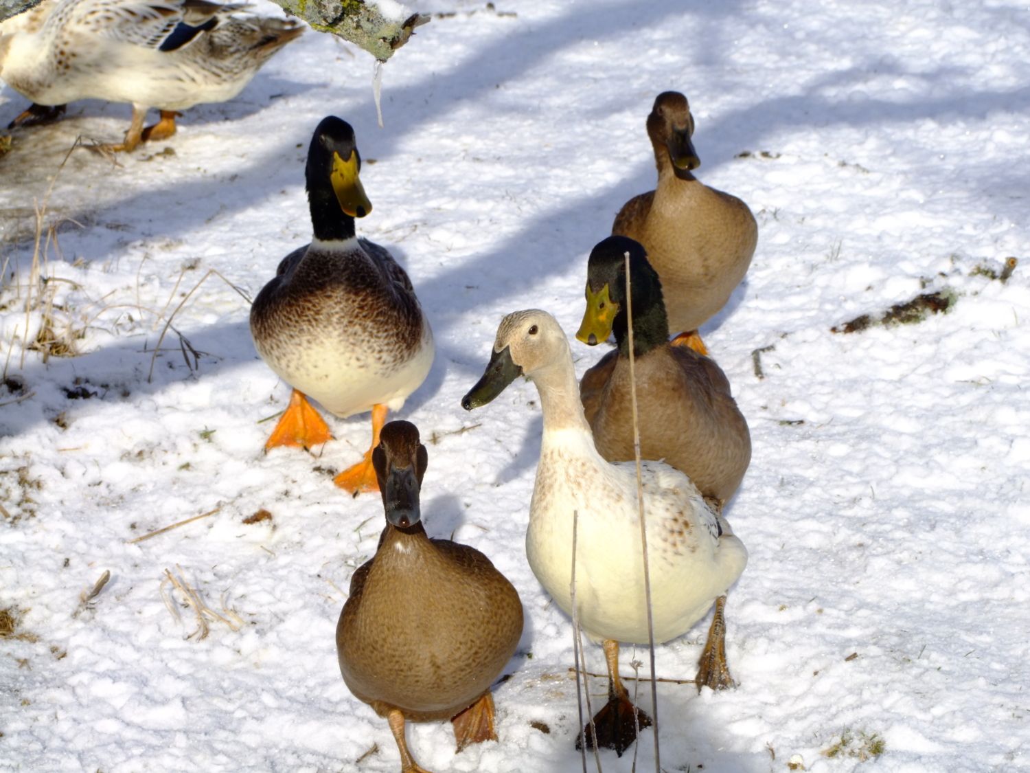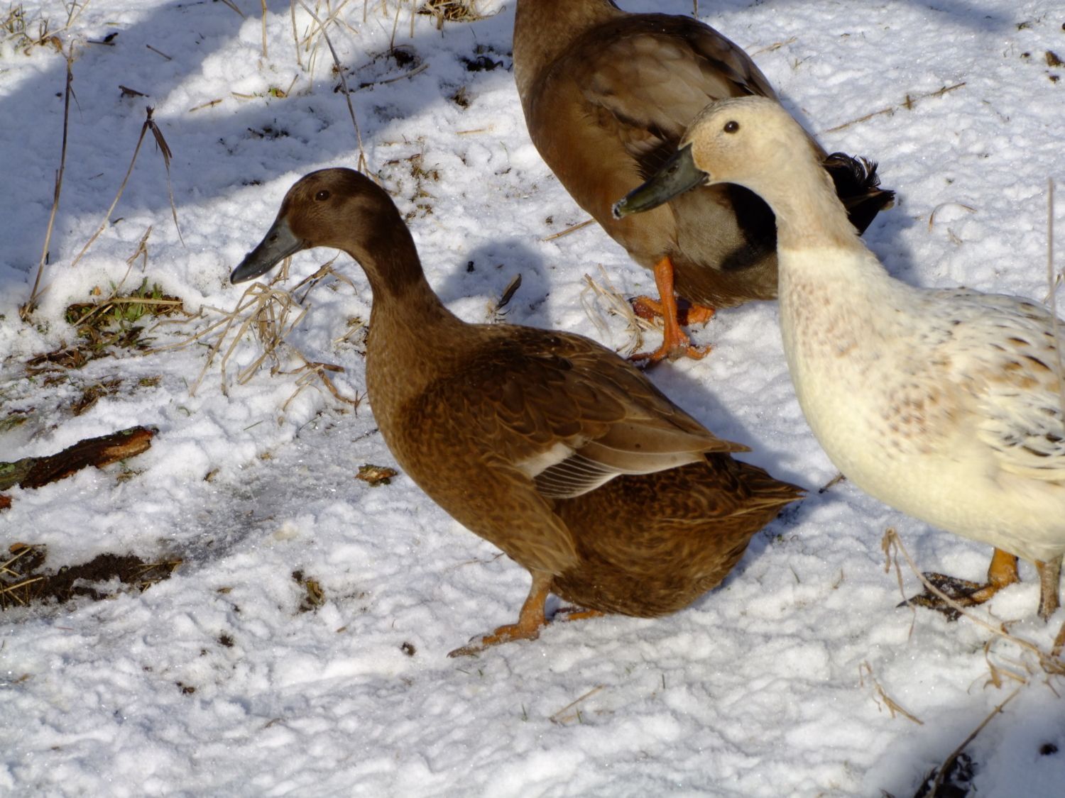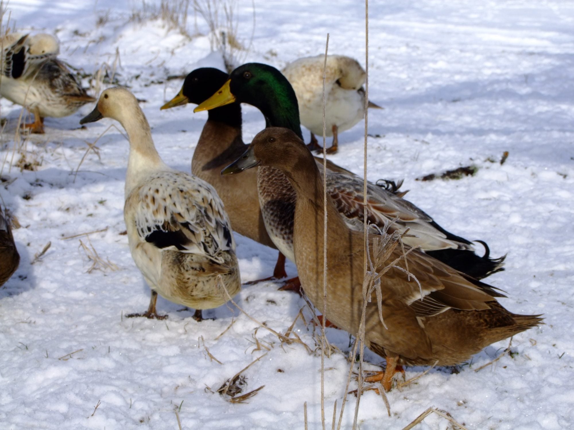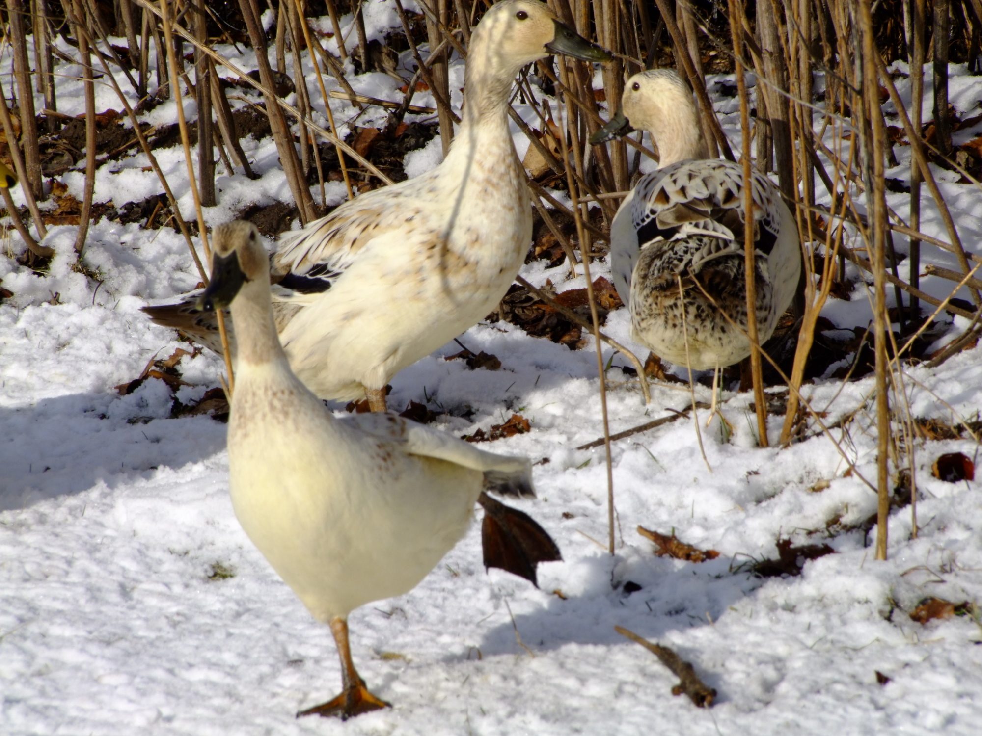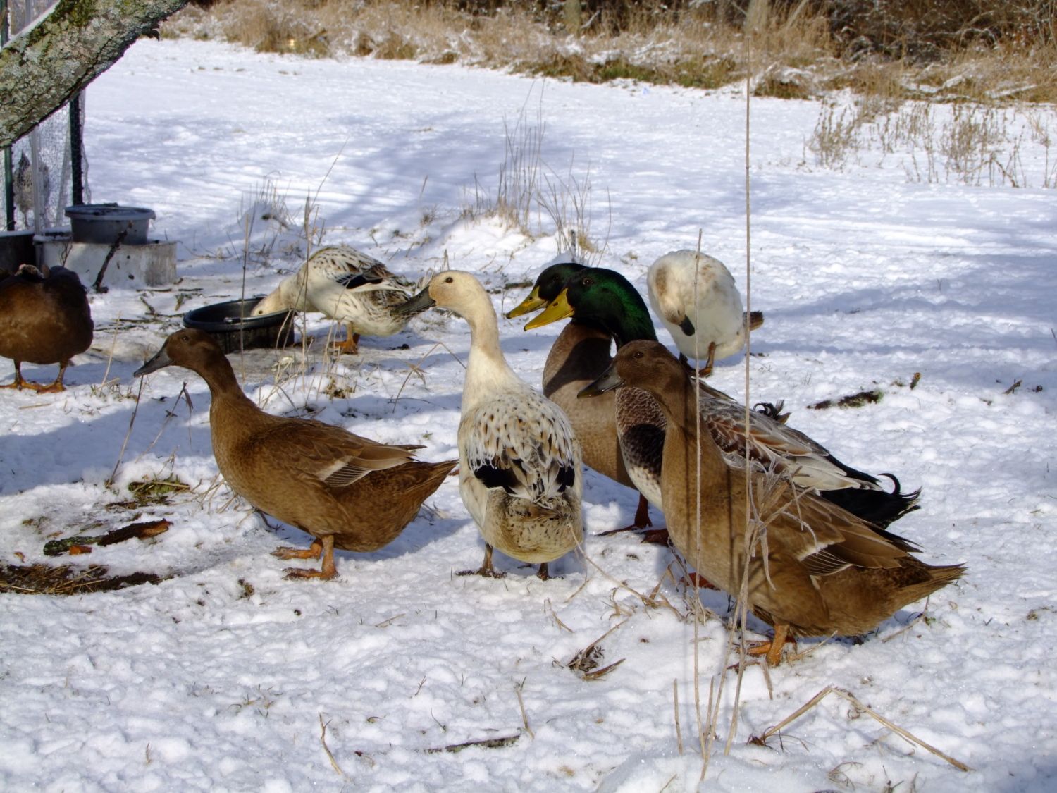 Here's a few photos I took of my Welsh Harlequins, and Khaki Campbell's this morning. I love watching them in the snow. I'm going to have to get some more since my hen to drake ratio is way off. Anyone recommend a hatchery or breeder that ships? Anyone have both breeds? I'm considering just keeping one kind, I love the looks of the Welsh but I really love the eggs which is how the Campbell entered the scene. If you've had both which is the better layer? lays the most, most regular layer, most long lived w/ production in mind. I've also heard that welsh are a better table bird then the Campbell any input there, these are my egg ducks but its a good thing to know. What breed is more suited to free range? I lost 3 hens this summer to crazy accidents, 2 were Khaki Campbell so I'm wondering if it was bad luck or if they aren't as bright as the Welsh Harlequin. one ate a wild mushroom in the yard, one got drunk off fermented fruit off our tree and tried to sleep it off on her back in the blazing summer sun and died of heat stroke, and one drowned herself in a bucket, I was starting to really worry I might have to have a intervention for depressed ducks or something, but it was awful losing that many in such a short time