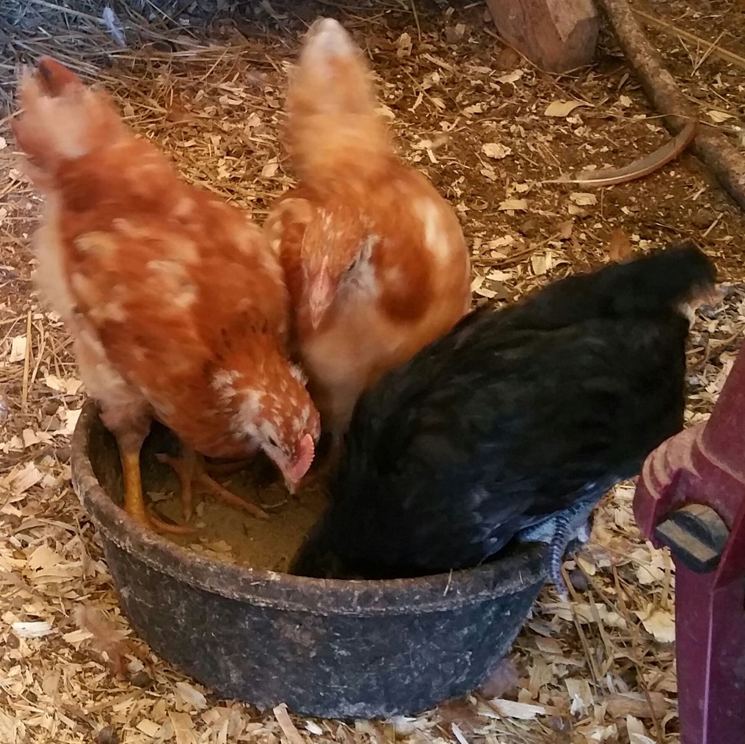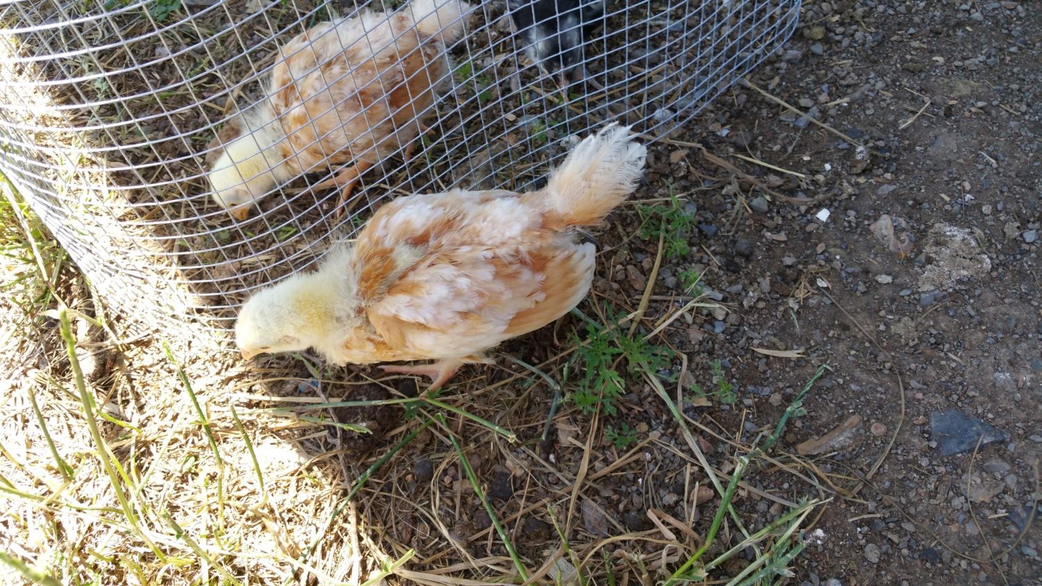 These chicks came from the co-op. I just don't remember what the sign said they were. I remember one of the bins being marked sex-link. The yellow chicks are from that one I think. The dark one may be a Black Ausultorp. I know they are not the Cherry Eggers.