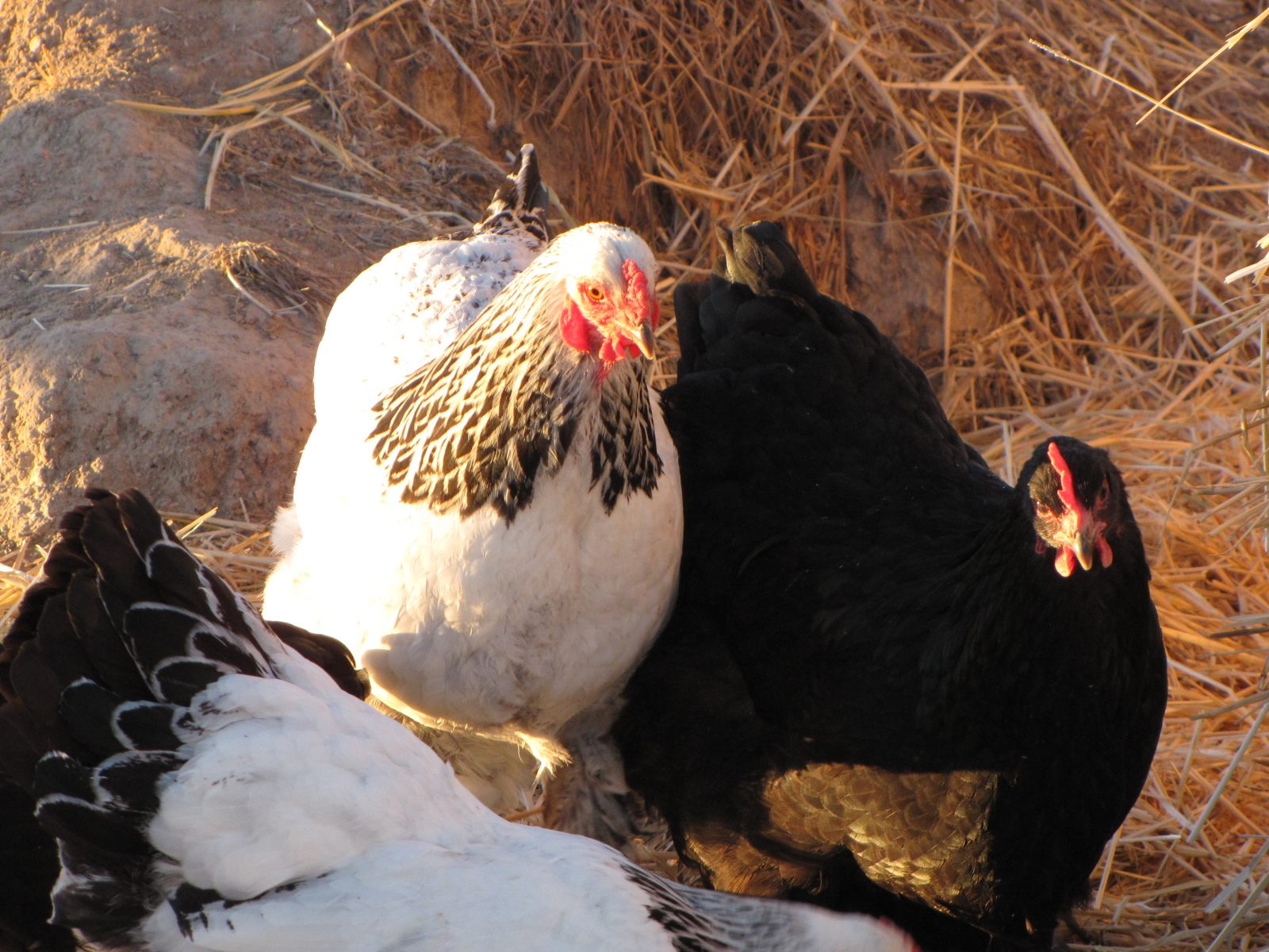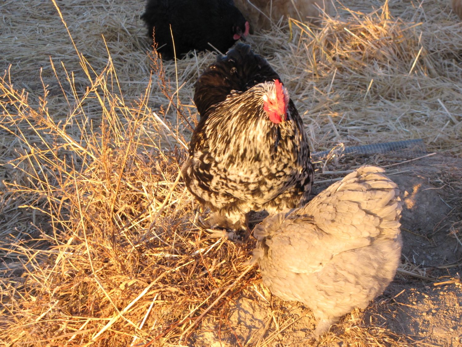 War Chicken (mottle bantam cochin roo) and Taffy (lavender bantam cochin)