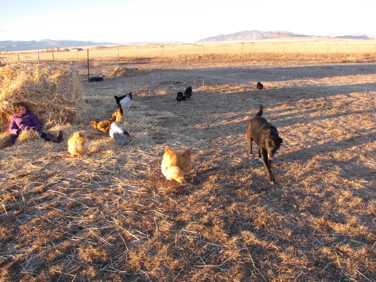 Hannah trying to stay warm, the crew and our great chicken herder Sadie