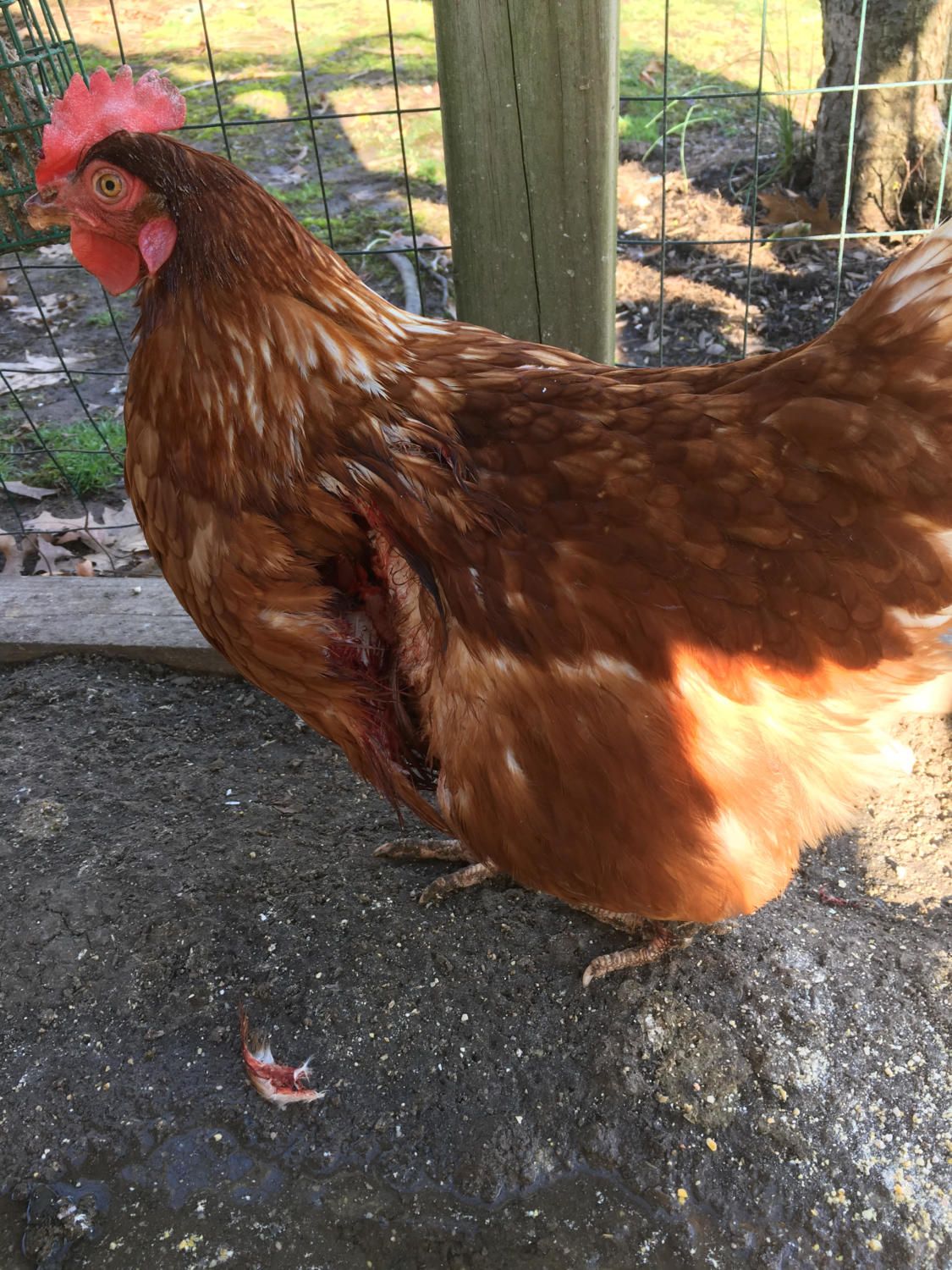Hey all! I'm new to BYC so go easy on me if this question has been asked before (it probably has). This morning The hens were making a lot of noise. I went down to check and I saw 1 single bloody feather. When I looked around the coop some more I found small areas with blood on the ground. Then I found the victim, one of my hens, Girtie, had a bunch of feathers missing from her left side, around the wing area.