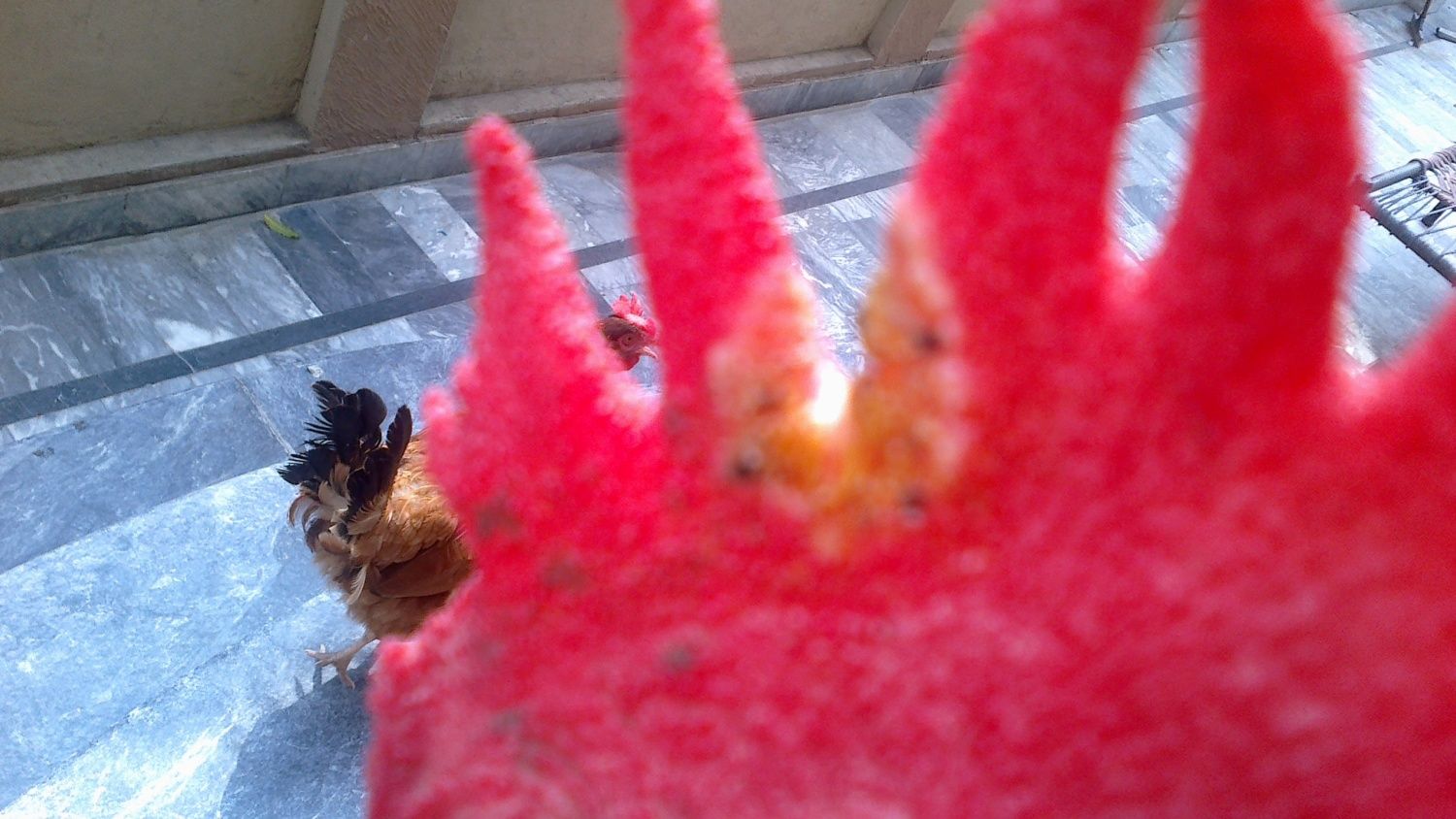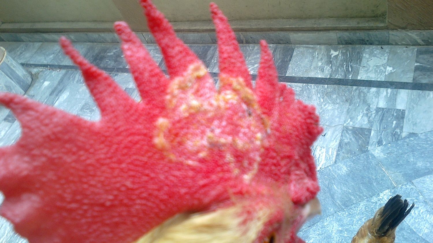 He got this infection on his comb after fighting with an another rooster.And some times this infection also gets black a littel bit.And now this infection is also spreading on the other side of the comb