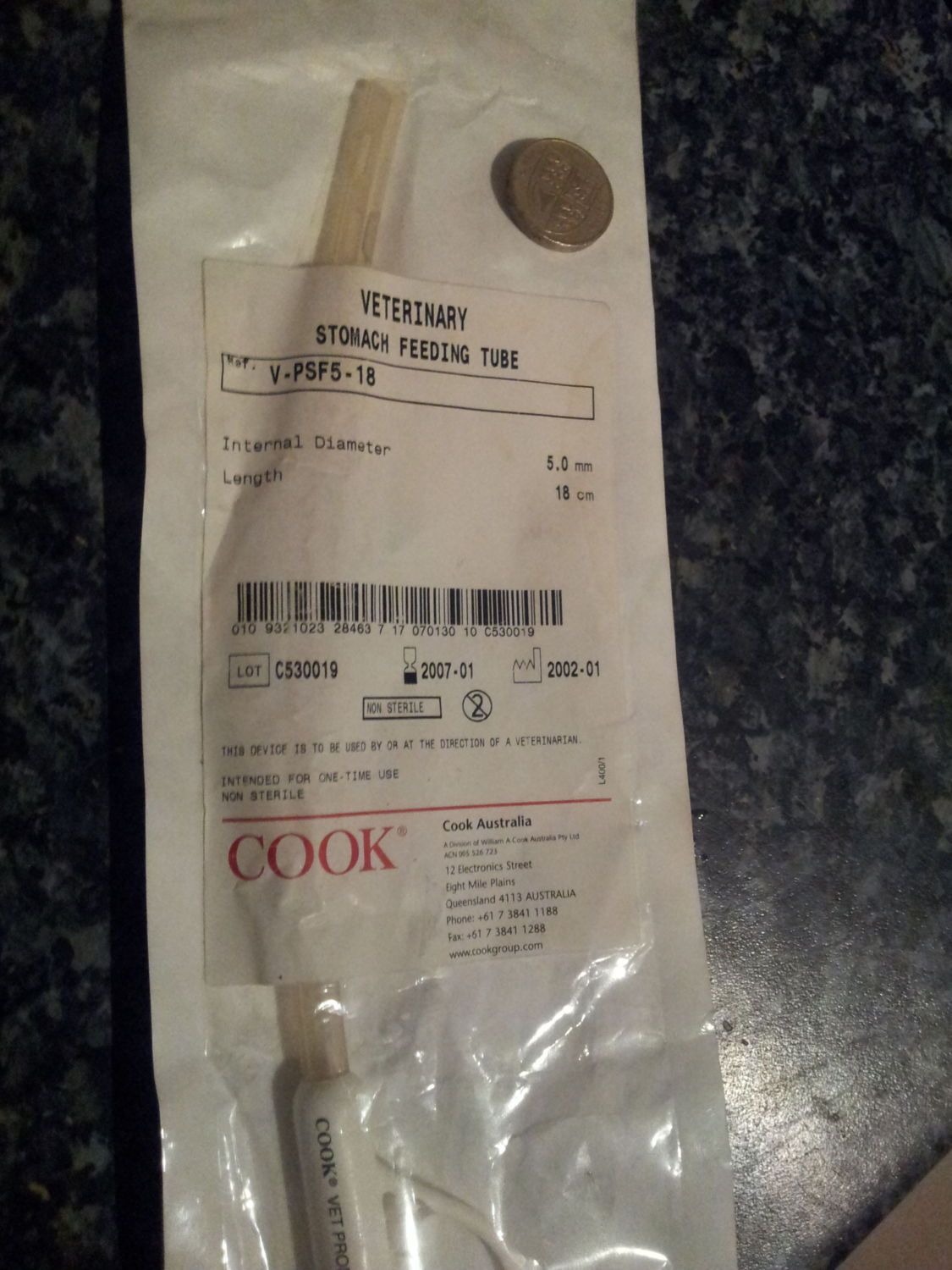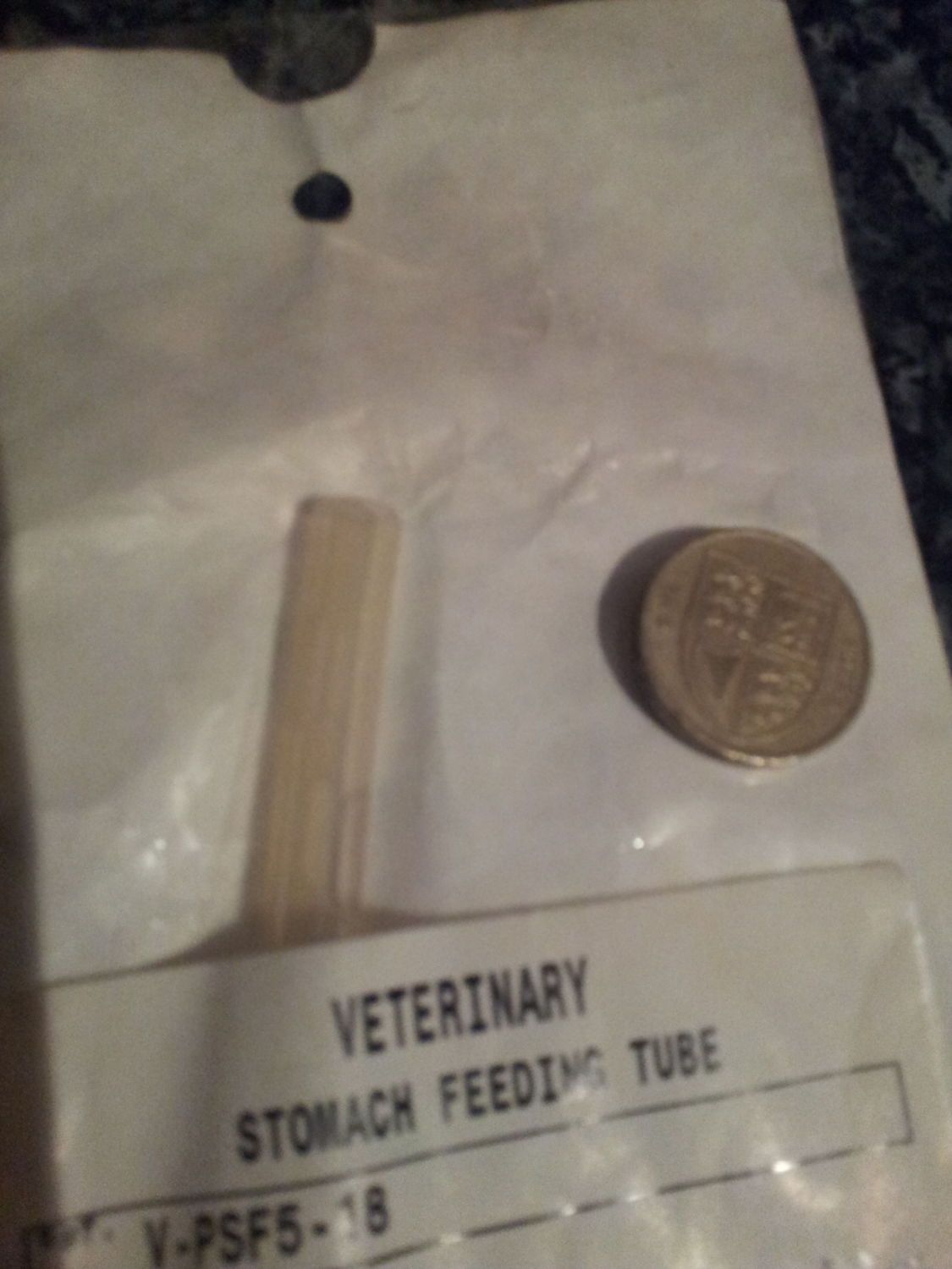 My God look at the size of that! But you know what? think of the chunks of wood Bombie has swallowed. This will probably be nothing to her. LOL. You can do it Shell. I think too they must have alittle flap to cover the wind pipe when they eat. So that might trigger as you pass the tube. I'm not entirely sure of course but trying to look closely at that diagram and think about them as they eat.