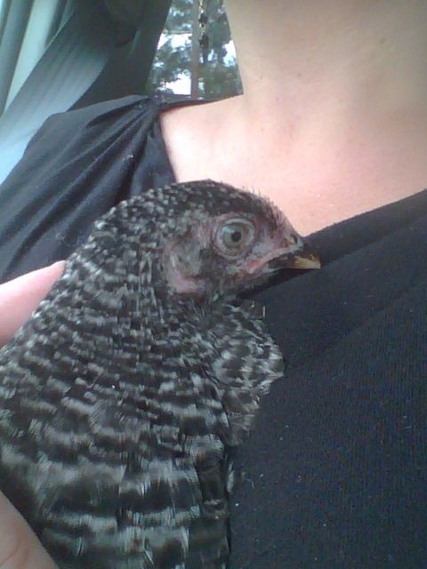 My hubby - who was not opposed to me getting chickens - it was just going to be MY project - hahaha - she's following him EVERYWHERE!! I love her to pieces. She makes the sweetest little cheeping noises. I held her all the way home and she even fell asleep in my arms. Awww..