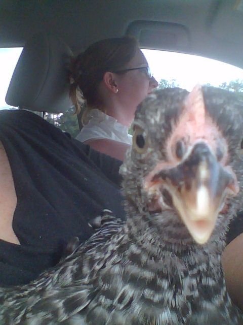 YAY!!!!!!!!!!!! I got my first chicken today!!! Thank you SO much Rob! It was great to meet you. She is now named Livvy - and she is quickly becoming spoiled slam rotten. She took no time at all in snapping bugs out of the air and making herself at home. And she got some tomato as a treat!My hubby - who was not opposed to me getting chickens - it was just going to be MY project - hahaha - she's following him EVERYWHERE!! I love her to pieces. She makes the sweetest little cheeping noises. I held her all the way home and she even fell asleep in my arms. Awww..