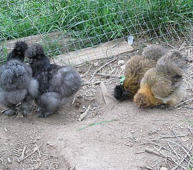I have 2 beautiful Silkie pullets from Sandy at Bat Cave Silkies and 2 lovely blue Silkies from my breeding pen. I can't wait to get those in breeding for Sizzle babies.