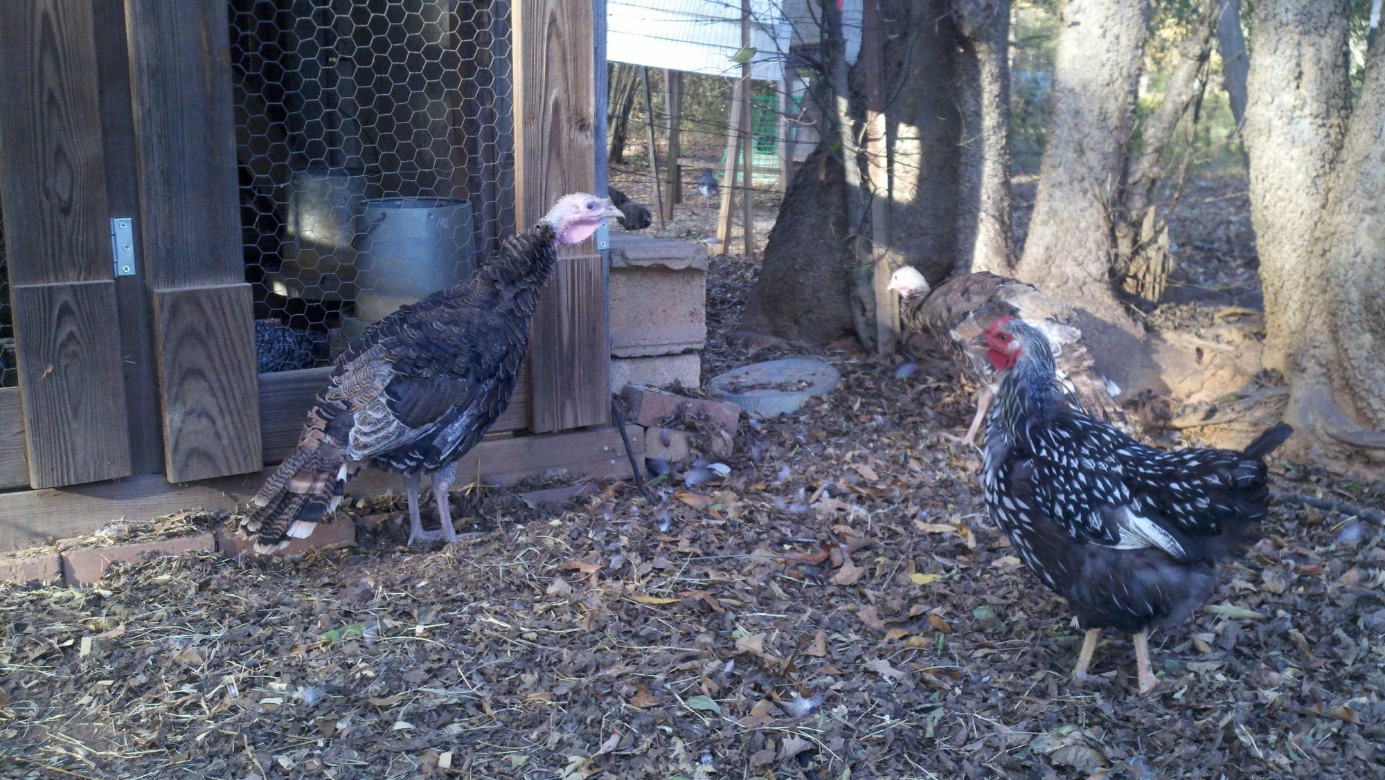 It's rather obvious I have a tom and a hen now. Look how big they're getting! Please excuse the badly molting wyandotte lol