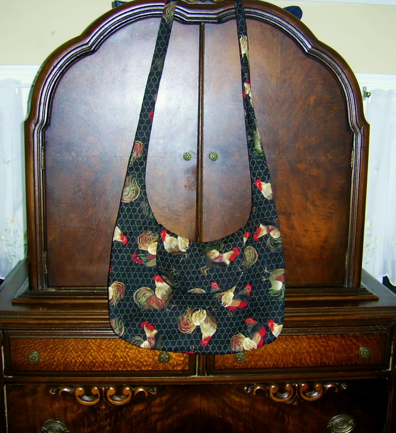 I buy designer fabrics....line them and make 100% cotton ..lined ....one of a kind bags. Use it long or short by simpy tying/knoting the straps where you like to be comfortable. Machine washable cold water and hang tp dry. Iron if you feel it's necessary. I carry my bali batic fabric bag everywhere and get many compliments. :)This purse has a black back ground and a colorful rooster tossed fabric.