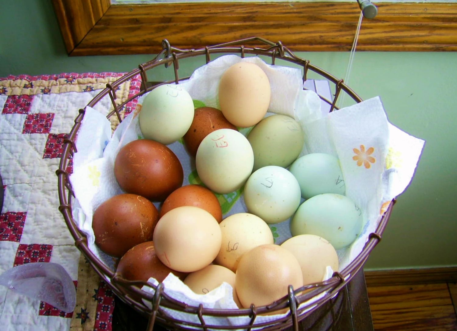 My basket of 17 eggs before setting. WOW! Red Roof Hens packed beautifully and sent me 6 extras in her special surprise package.. Only 1 broken. So now I hope to see hatch a hatch of BCM, EE, Lav. Orp, BLRW, Lav AM