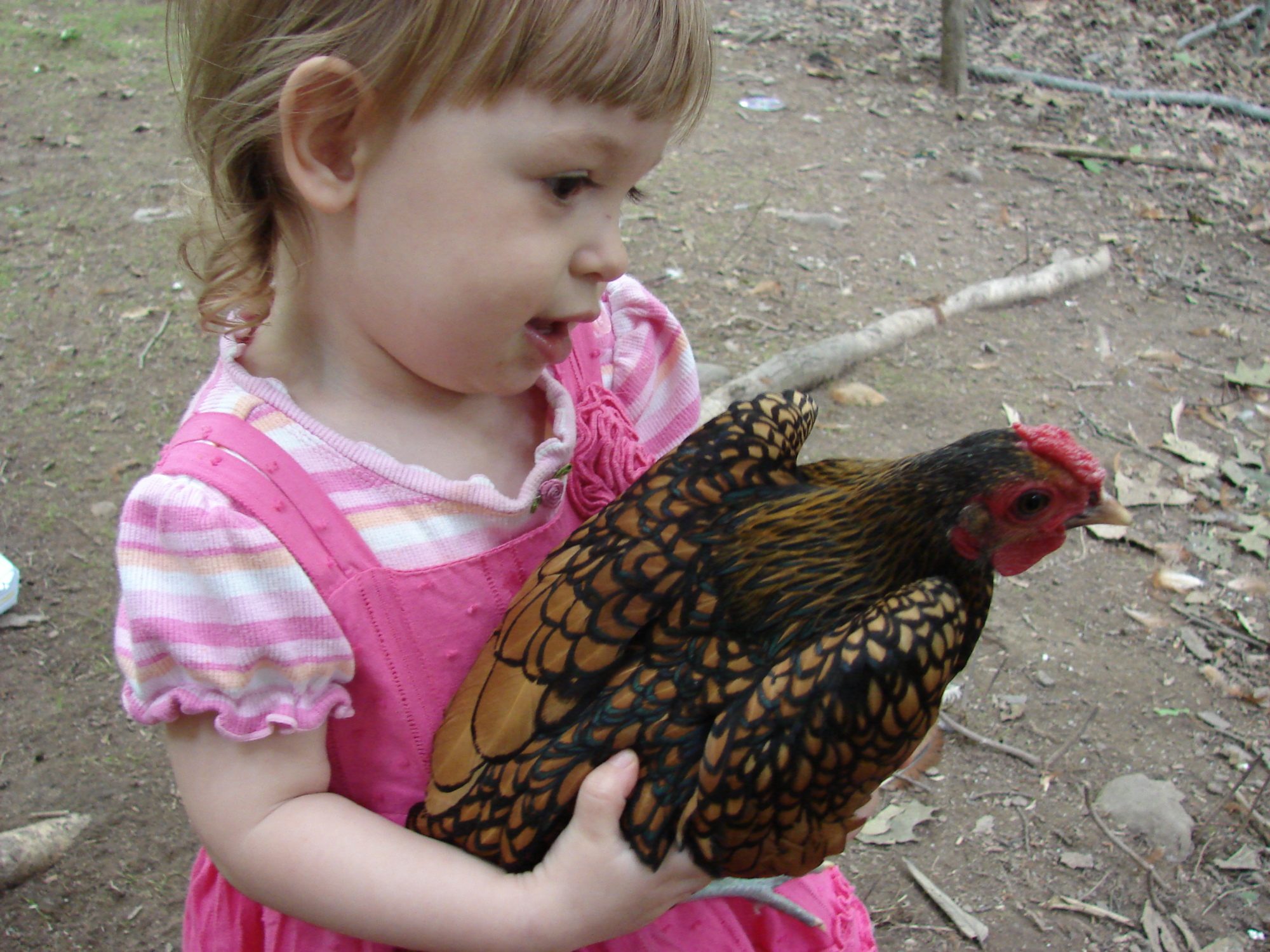 Caleb, your sister is completely adorable, "Gik-ens! Gik-ens!" I love that she is so patient and calm holding the rooster, who is also adorable (handsome?) Pinocchio is very good-looking indeed. What breed is that?