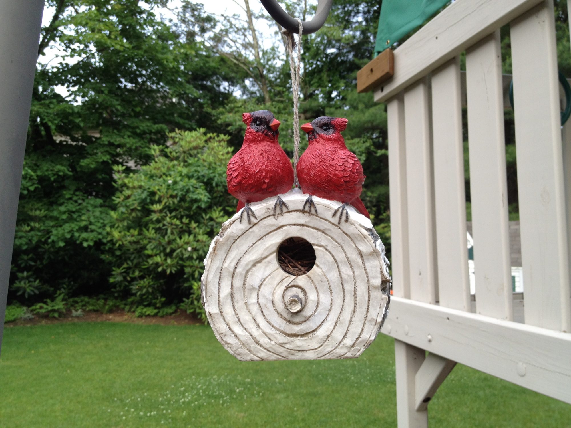 Our tree swallows are still nesting, thank g, I though some sparrows had evicted them but i checked and they're ok. I also have nesting wrens in the yard in what I like to call the Fabulous Gay Cardinal Condo. Something cheap that I picked up at K-Mart ages ago, and since it was made in China I don't think they realized that female cardinals have a different color than the males, hence this:
