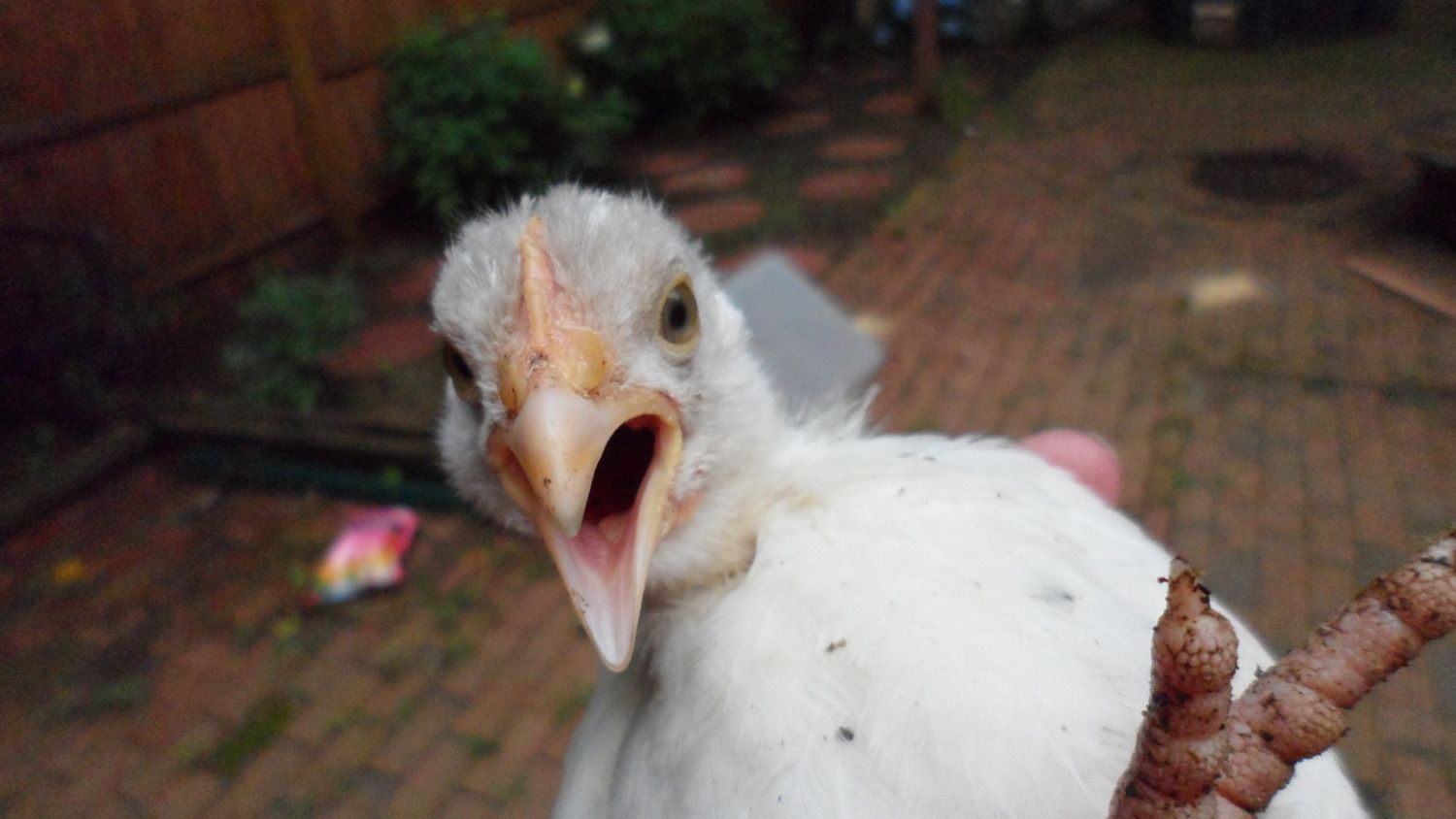 This is the same White Orpington, screaming to be let go. I'm thinking POW on this one. Doesn't help me to decide its gender, but it makes me laugh...