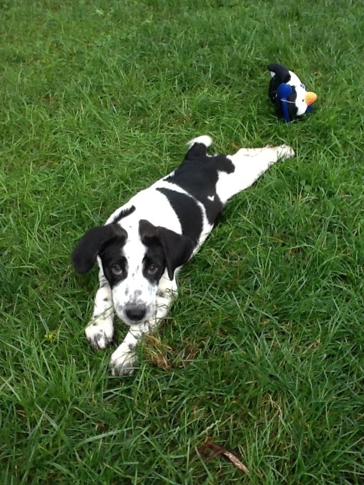 Overall, he's a great dog. Plays a fair amount during the day and sleeps a lot. Does not whine at all. If he is a pointer/border collie mix he will get to 60 lbs. or thereabouts. That'll be three times the size of the other dogs we have. So far his personality is such that he is not challenging the present occupant of the alpha-dog spot, our Maltipoo. That's probably why everyone is getting along so well.