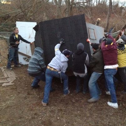 With lots of muscle power they righted the wooden coop back up.
