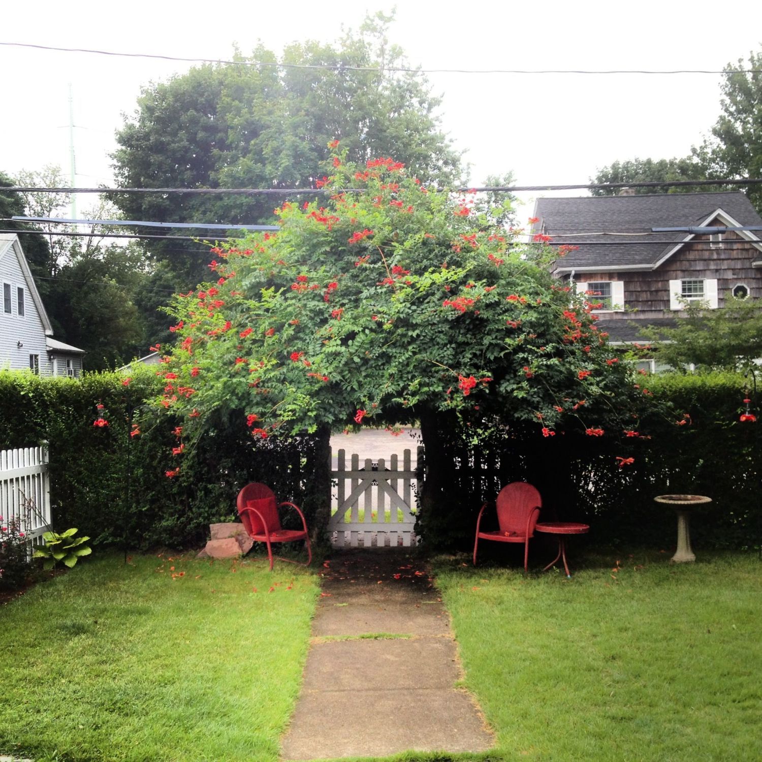 Just beautiful and what I have in mind for the front of my house. I need red too. I have little red painted hearts (dh did them at risk to life and limb) in the 4 gable peeks of my gothic revival type house. I need red accents.I have a very old, very red trumpet vine growing out front. These colors in the photo have been enhanced thanks to Instagram but you can see that the red matches the bright red color of the hummingbird feeder and also the very red chairs. I really love our trumpet vine. I definitely heard it calling our name when we first pulled up in front of this house 4.5 years ago. The plant was alive with bees and probably even hummingbirds but I didn't know about them until the last 2 years.