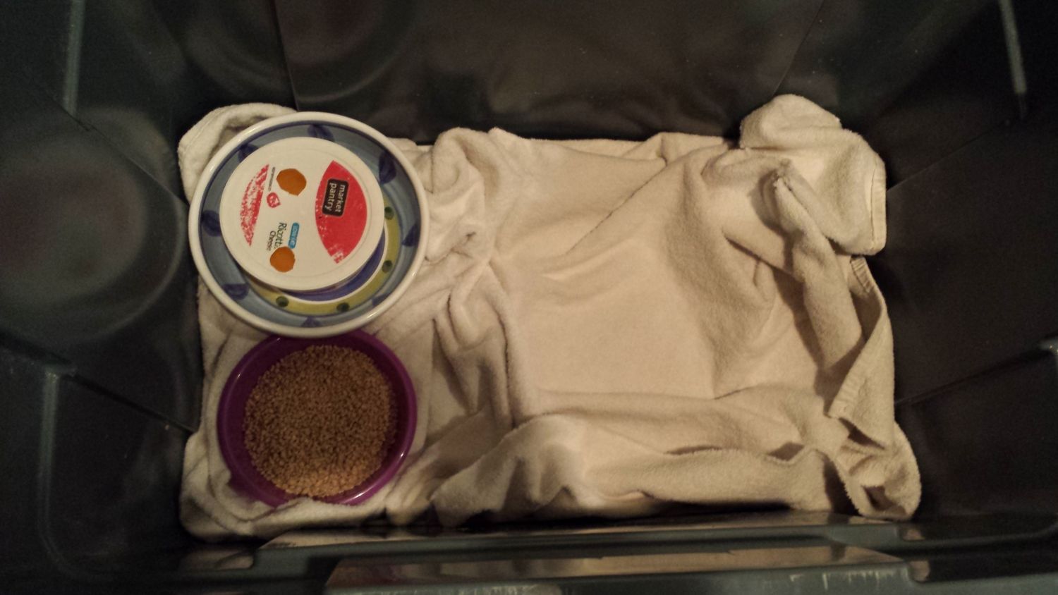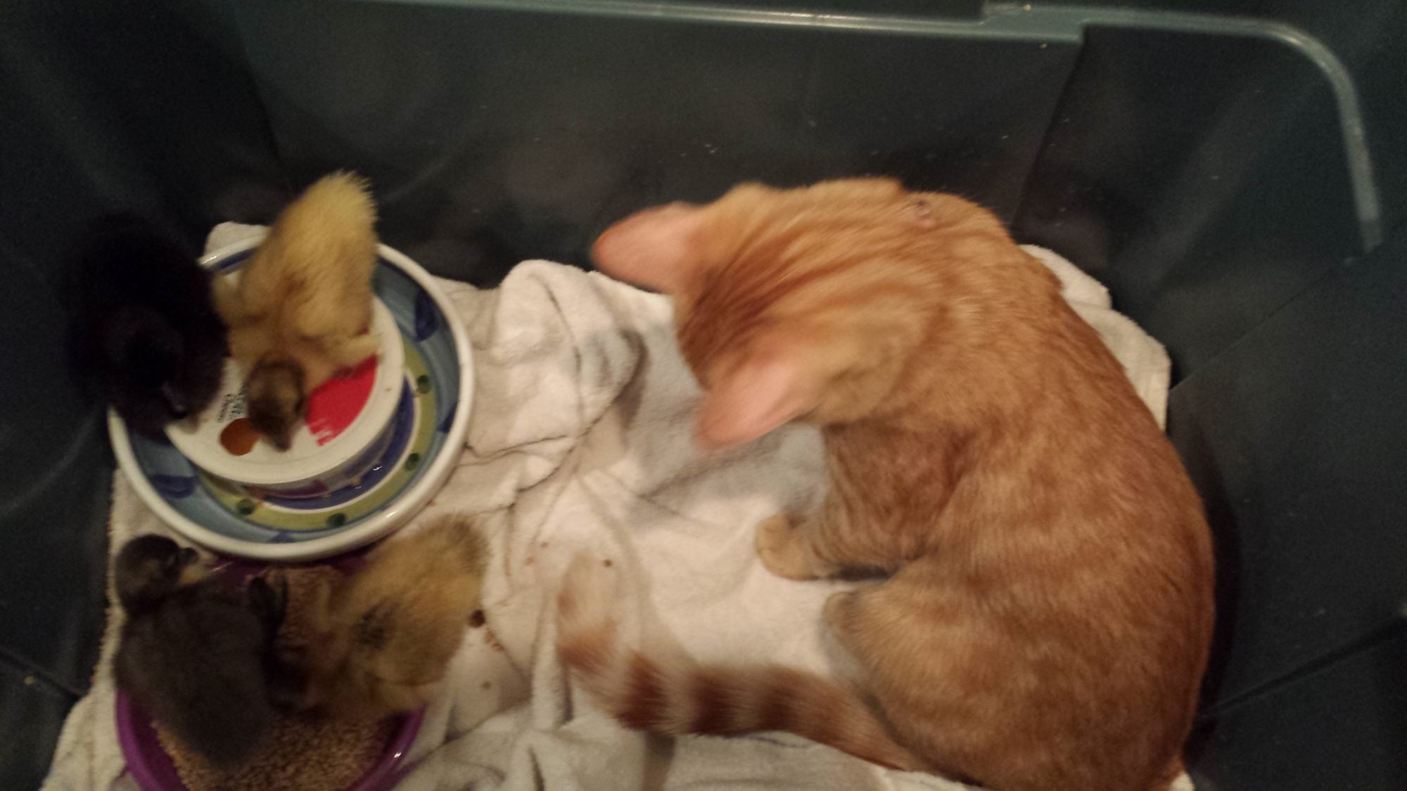 This is my brooder setup--through a lot of trial and error over the summer, this is the best setup I have found to keep the babies mostly dry and the water mostly clean: