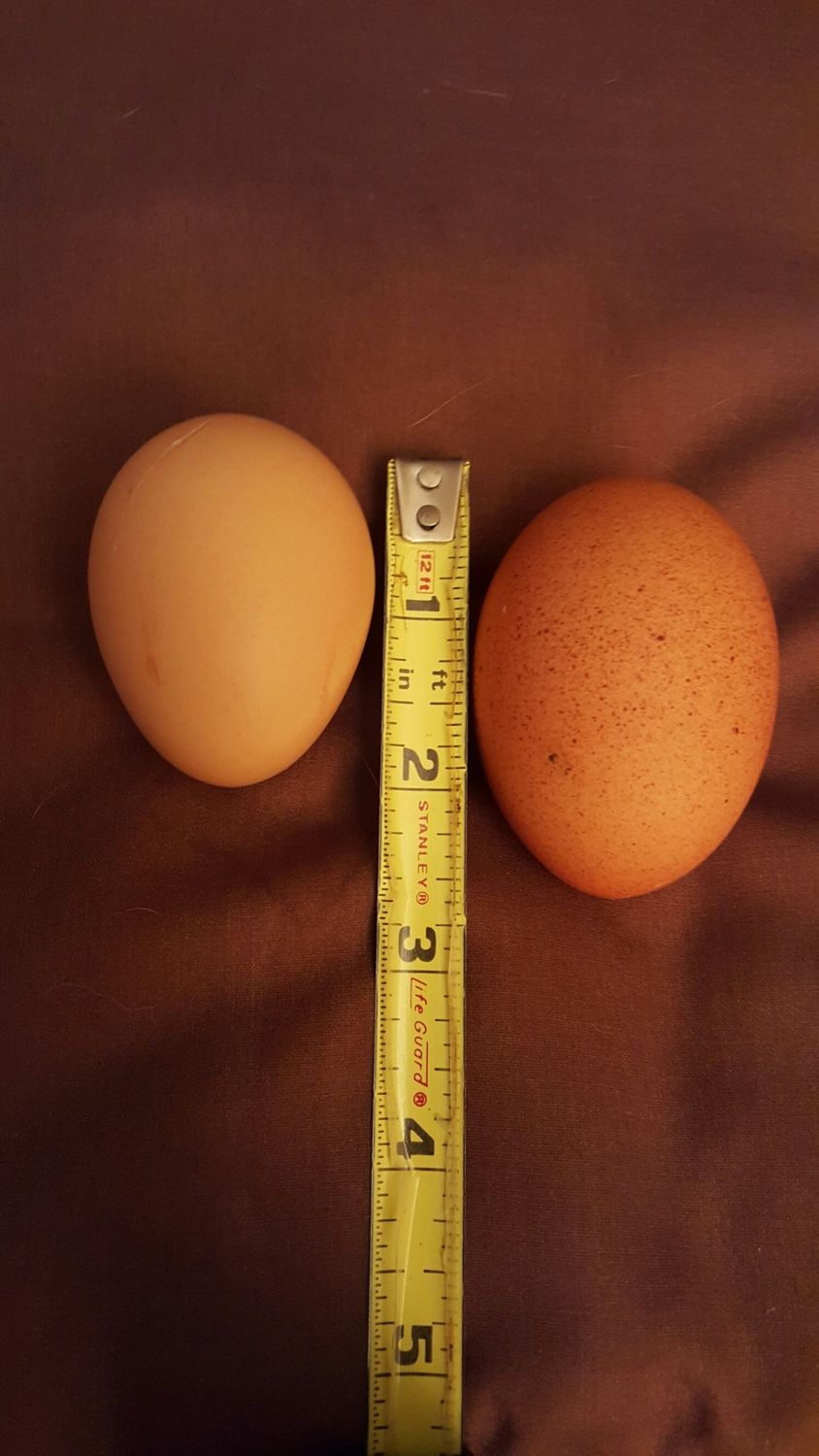 The egg she laid was a large egg, cream colored with a slight pinkish tint. It was as big as those of our 2-year-old Welsumer, Nellie.